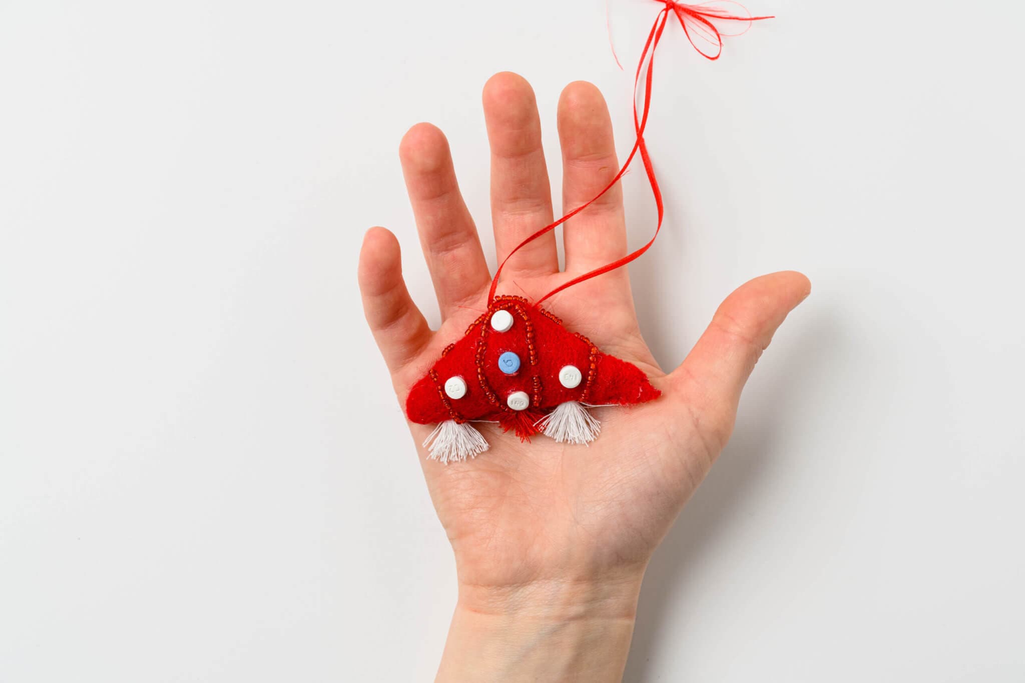 Charlie Dov Schön, Post-Roe Protection Amulet, 2023. Felt, norgestimate (birth control – brand Sprintec), beads, ribbon, lace, thread. 5′ x 2′.