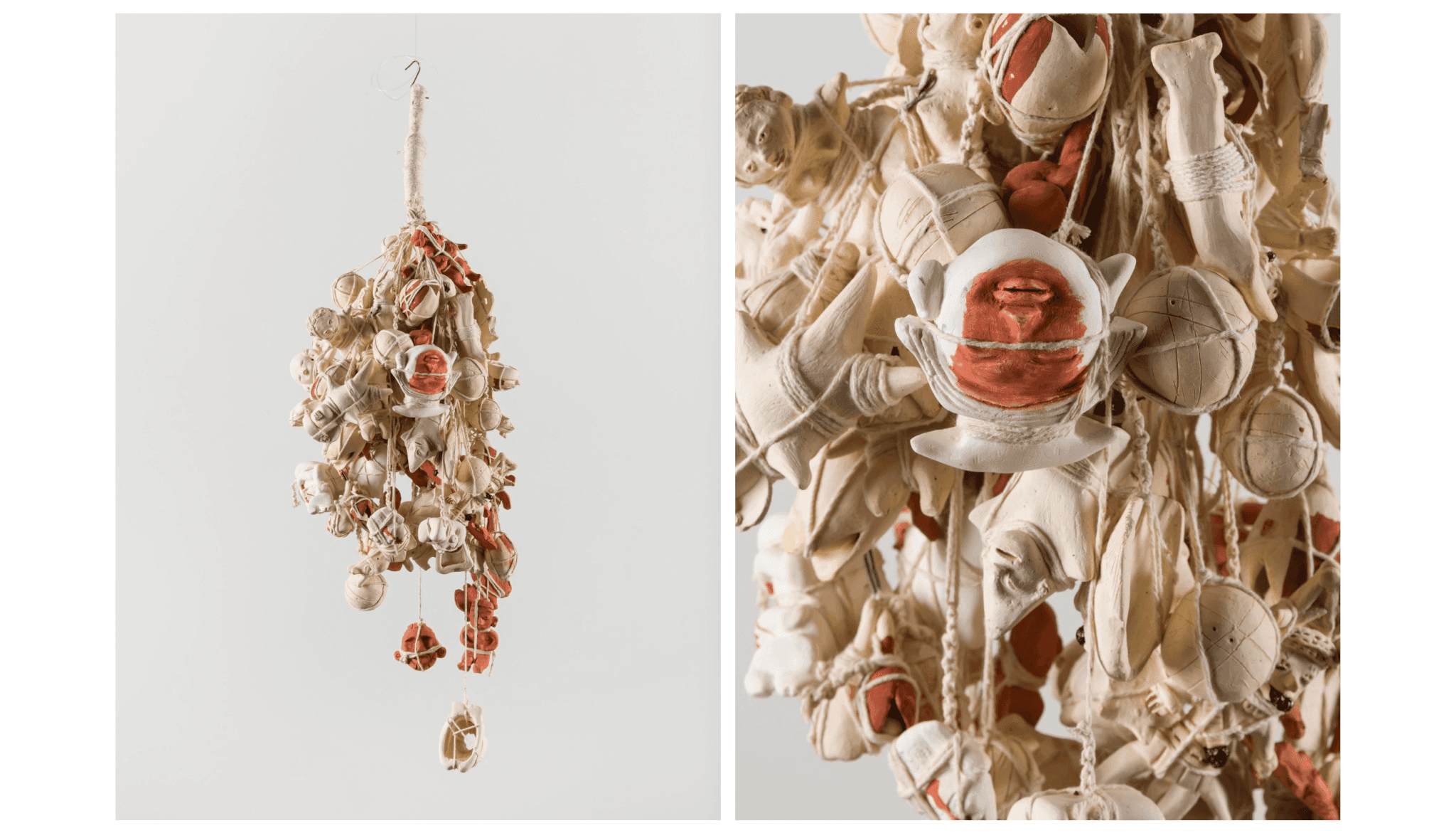 (left) Noé Martínez, Racimo 3, 2022. High-temperature ceramic and porcelain with oxide slip and cotton rope. 32″ x 8¼ ” x 8¼”. (right) Noé Martínez, Racimo 3 [detail], 2022. © Noé Martínez; Courtesy of the artist and Patron Gallery, Chicago, IL.