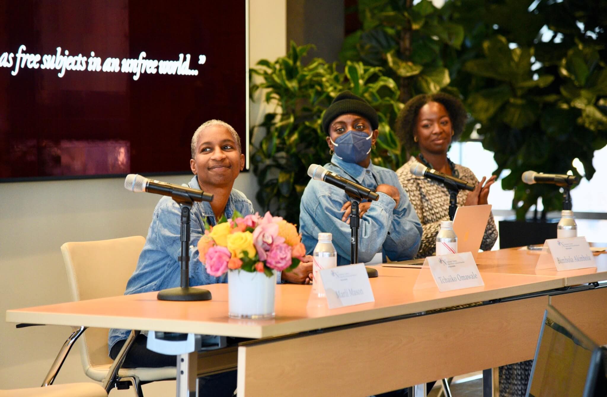 (left to right) Tchaiko Omawale, Bimbola Akinbola, and Aja Burrell Wood during their panel, “Art Matters.” Photo by Vania J. Arroyo. Courtesy of Northeastern University.