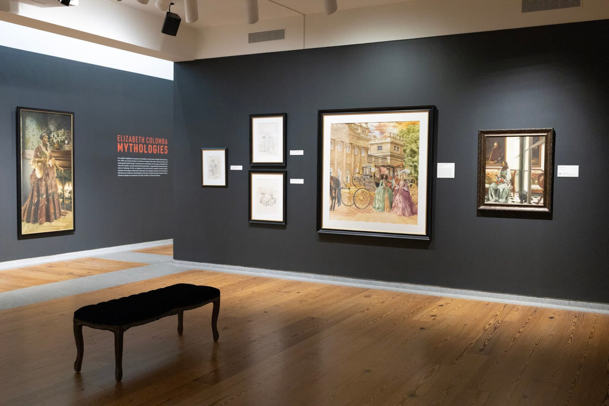 When the French-born, Harlem-based artist Elizabeth Colomba starts an oil painting, she does so like the masters, beginning with the grays of an underpainting, slowly building up color and texture on eighteenth-century petticoats and patterned wallpaper until she’s left with the final details: the delicate tatting of a lace cuff, the tiny scarlet feathers of a cardinal’s wing, or the light glimmering around a cloud of black curls. At “Mythologies,” her solo show at the Portland Museum of Art, we’re invited to do the same, first by identifying the story that informs the work (her titles typically hold clues) and following the breadcrumbs she’s left along the way in fabrics, furniture, and animal familiars until we’ve fully entered her world, one populated by resolute and magnificent Black women inhabiting the stories they’ve been violently written out of.
