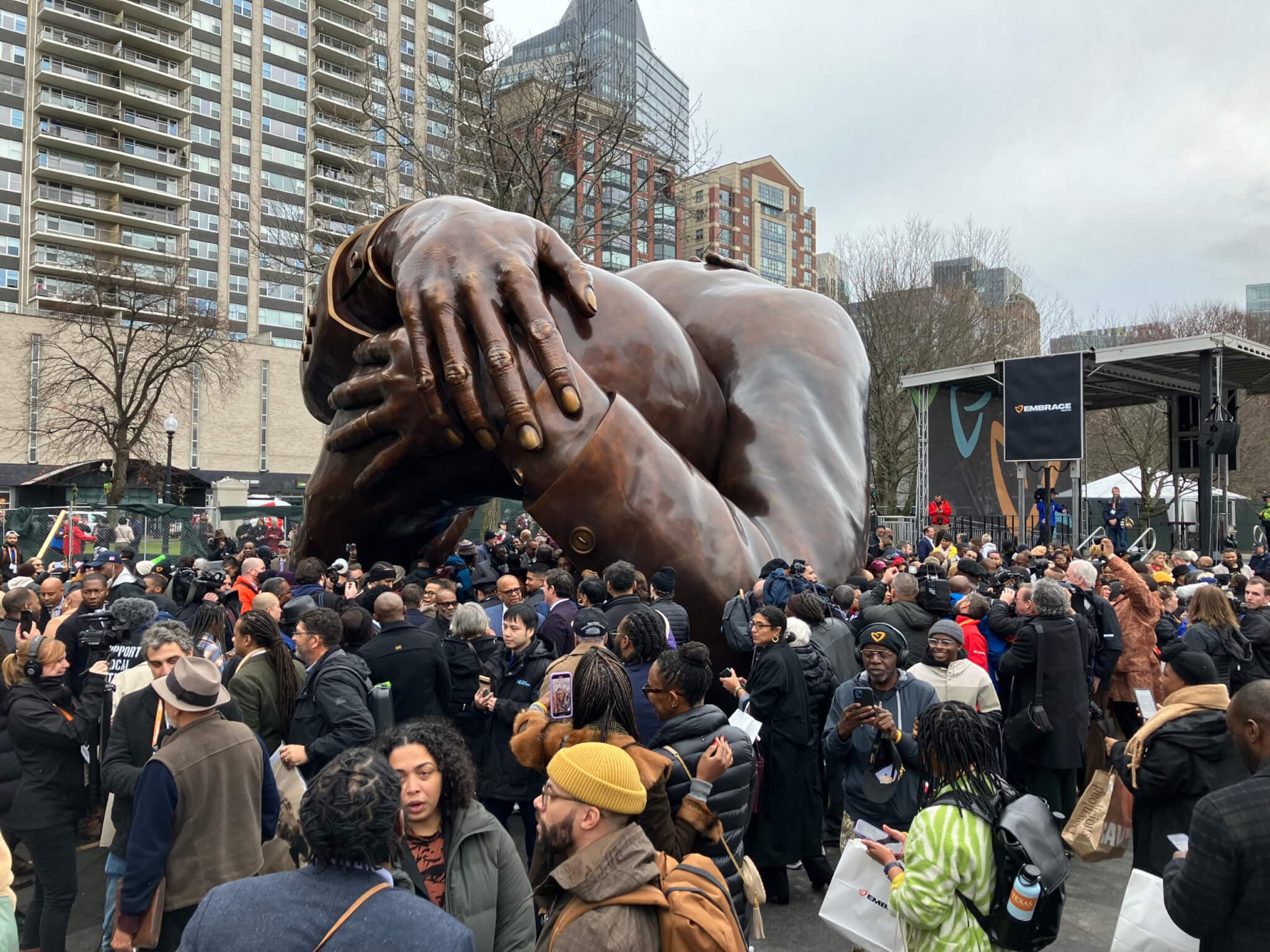In April of 1965, Dr. King returned to Boston to lead the first Freedom March in the Northeast, with a crowd of 22,000 people marching from Roxbury to Boston Common. While here, Dr. King spoke to a joint convention of the Massachusetts legislature, calling on them to address issues including de facto segregation and barriers to voting access. When speaking of this event, Dr. King shared with the Boston Globe: “Little did I imagine that such a day was possible when I walked through this same Boston Common as a student ten years ago,” nodding to his time as a student at Boston University. “This will go down as one of the greatest days that Boston has ever seen.” And later, he emphasized, “The vision of the New Boston must extend into the heart of Roxbury.” Is The Embrace a vision of King’s “New Boston”?