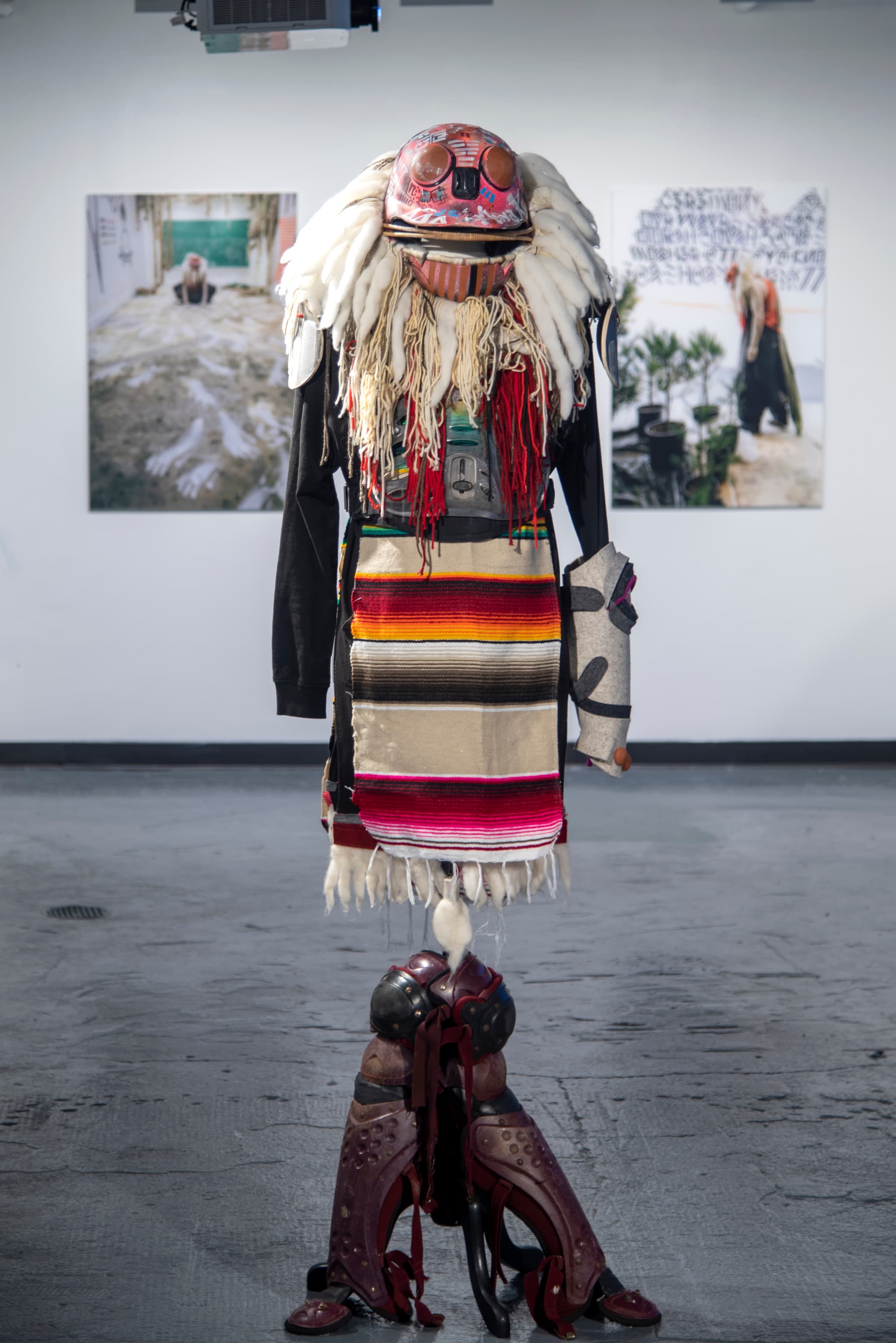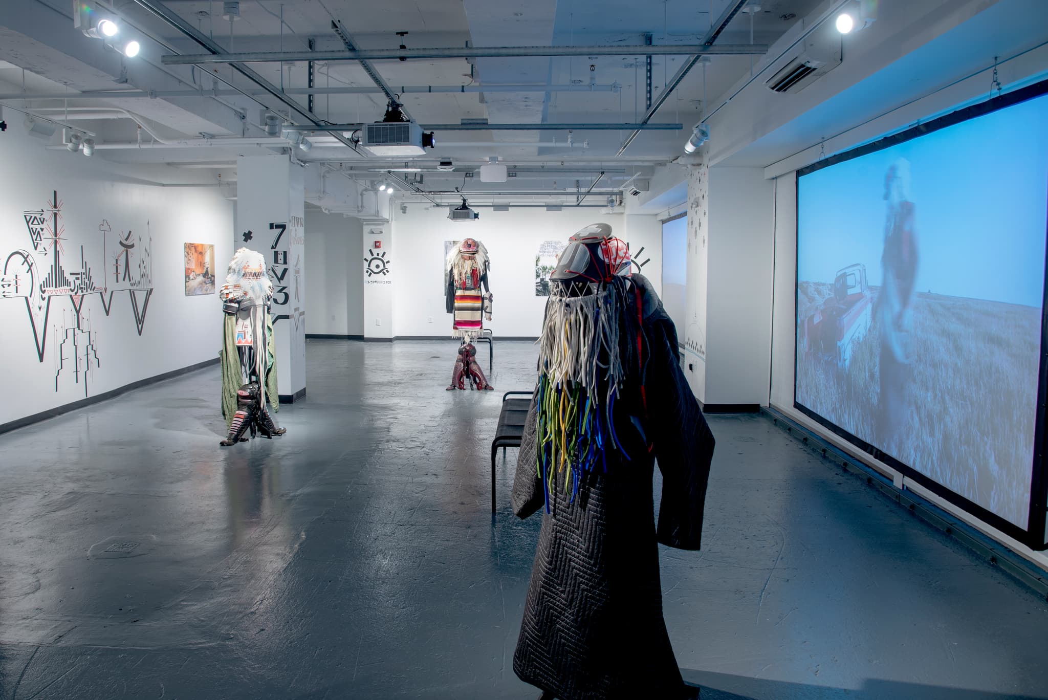 Set eighty “cycles” after Earth becomes virtually uninhabitable, Luger imagines a period when “the colonizers” have been forced to leave the planet by their own destructive tendencies, and ancient Indigenous cultural practices are not only relevant, but necessary for survival. Here, Luger presents a storyline in which Indigenous people and people of color are protagonists with agency to determine their own futures, even after the colonizers have done their best to destroy them. In Luger’s video, “We Live,” which outlines much of the mythos for the exhibition, the somber voice of a narrator relates the story of how colonizers and the wealthy have mined the earth to create “huge ships” in order to flee the planet, leaving gouging wounds upon the earth in their wake. The objects in the gallery are created in response to the need to ‘clean up’ or atone for the sins of the colonizer, fabricated as items of ritual in a never-ending apology to the earth. Videos demonstrating the use of these ritual materials are spread throughout the gallery, showing unknown figures moving with somber reverence in regalia made of recycled materials that obscure their faces. Despite the destruction inherent to the story, the viewer can’t help but find hope in the peaceful nature of these videos, especially those set in the open plains: the peace of an earth without capitalist machinations serves as a reminder that even when we die out, the earth will survive. Combining technologies of the present with traditions of the past, and blurring the lines between storyteller and visual artist, Luger is able to speak to issues across time and space. He asserts that our current culture of production, materialism, and individualism is a fleeting moment in the grand timeline of our earth’s history that will someday crumble and leave lasting effects.