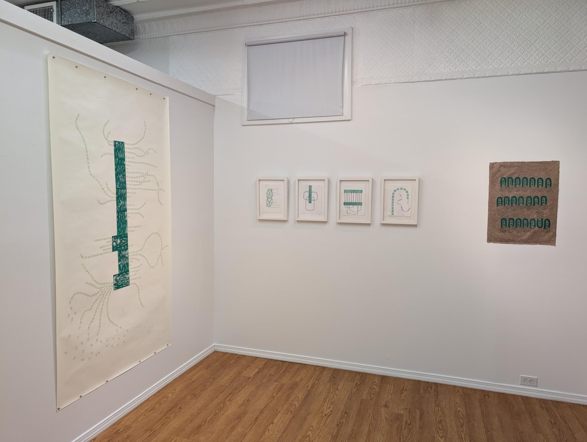 Atukọ̀ is the Yorùbá word for navigator, and at Drive-by Projects’ storefront gallery, Fúnlọ́lá Coker’s drawings and sculptures are positioned as tools for wayfinding where lines are carved, stamped, and dotted into meandering paths. Some of the drawings are exercises from a 100-day practice with numbers in the top right corner (days 72, 74, 75, etc.). Bright green block print patterns evocative of indigo-dyed patterns of àdìrẹ eleko cloth anchor the composition while black dashes and dots move between the shapes with winding or geometric paths. Others feel more precious—a series of five drawings on handmade paper reveal tiny bits from the artists’ hair dancing across the weave of the page. Coker is a masterful sculptor with an expertise in metal casting (a spindly steel and alabaster sculpture resembling a delicate coatrack stands coyly in the window), but here, a different side of the artist is revealed where pen meets paper. —Jameson Johnson