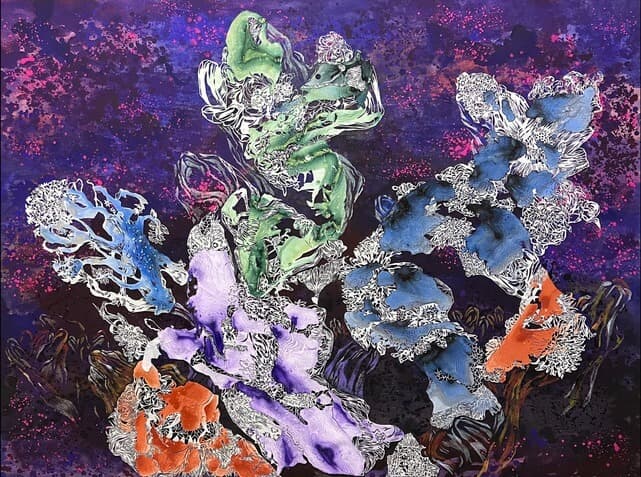 YoAhn Han, Purple Forest, 2025. Acrylic gouache, watercolor, Flashe paint, colored pencils, yupo paper, and resin on panel, 48 x 64 inches. Courtesy of Chase Young Gallery.