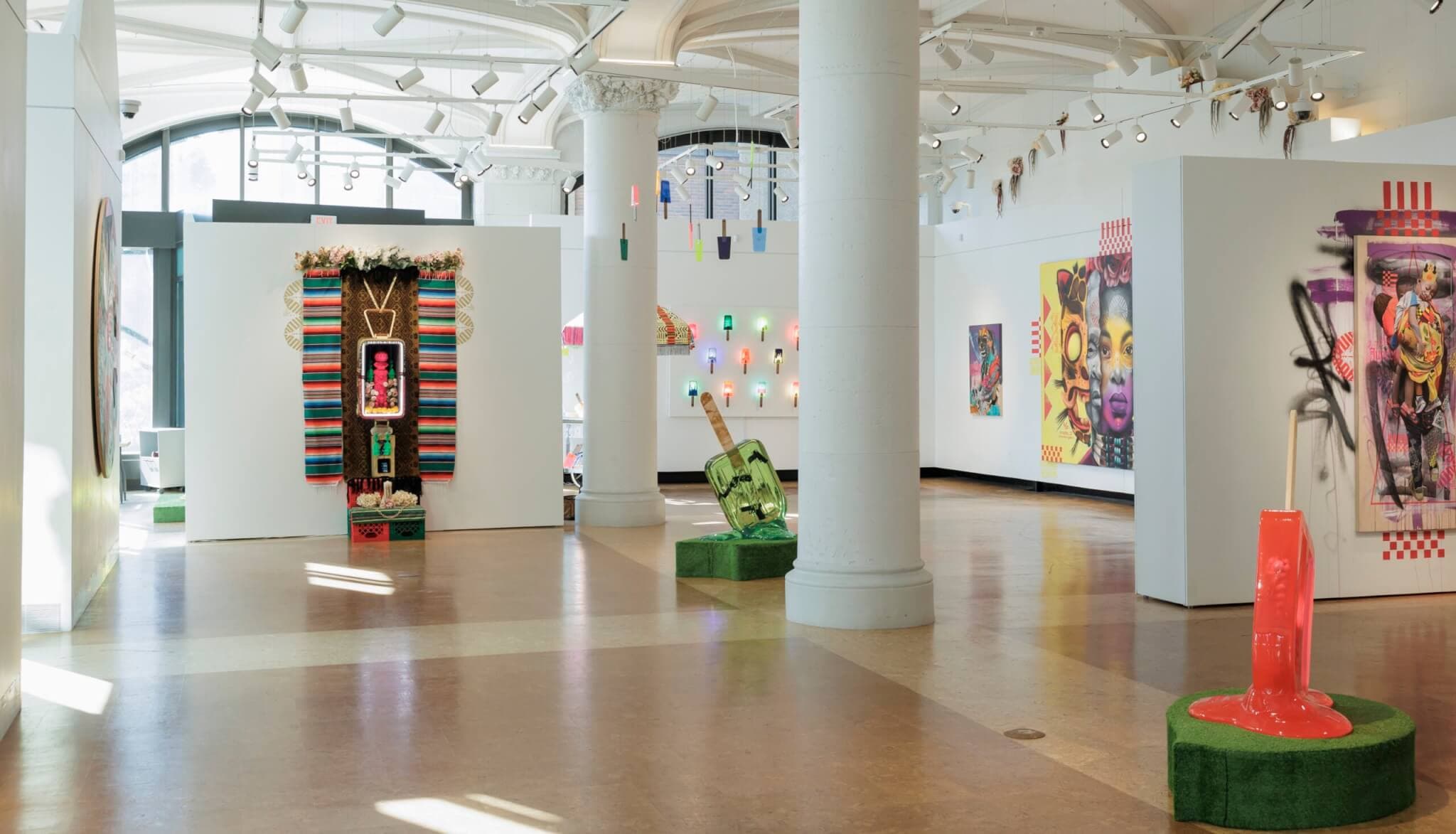 Installation view, Victor “Marka27” Quiñonez, “Ni de Aquí, Ni de Allá (Not From Here, Not From There),” Boston University Art Galleries, 2025. Photo by Tom Correira. Courtesy of Boston University Art Galleries.