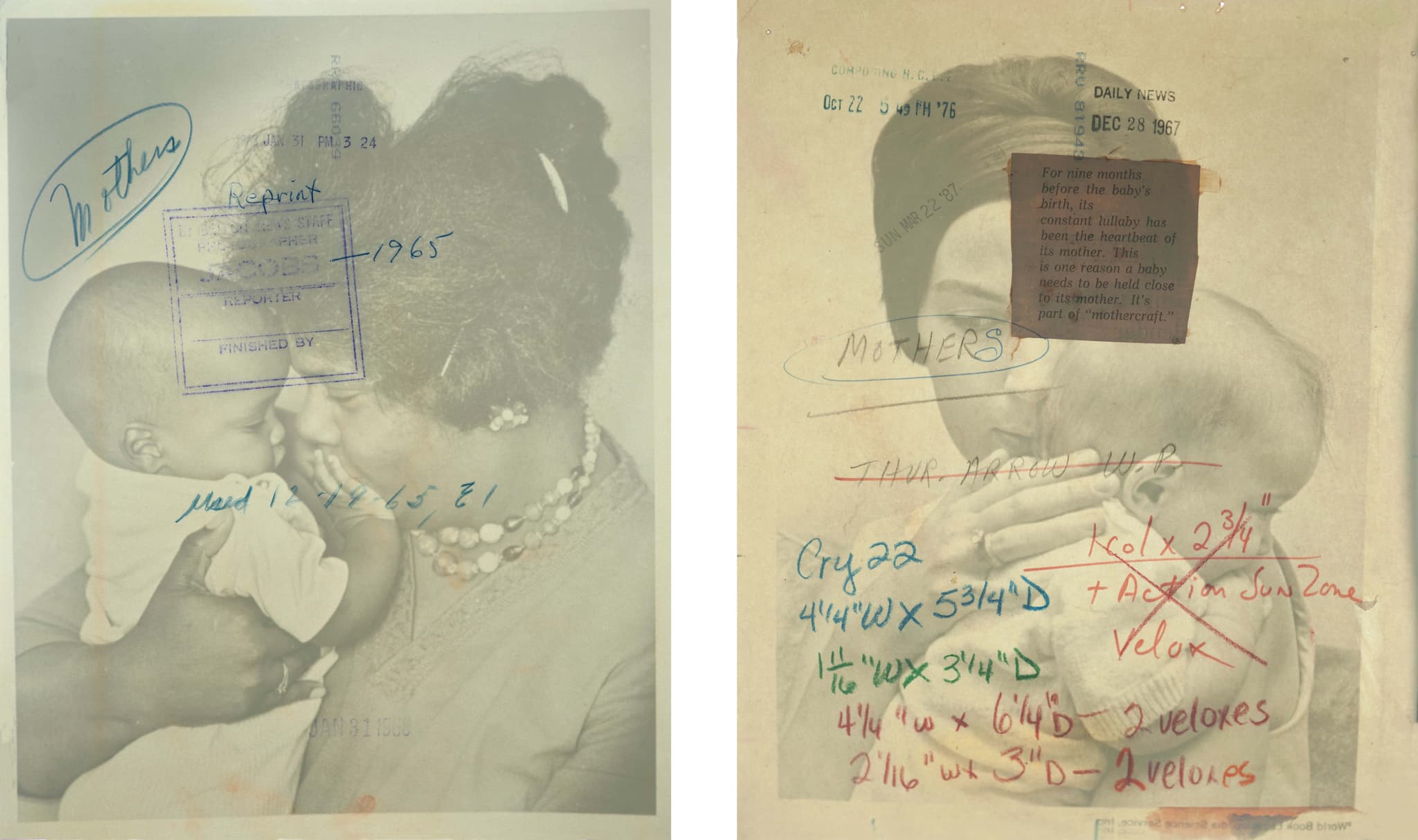 Left: Toni Pepe, Mothers, 2022. Archival inkjet. 28″ x 35″. “Mothers, used 12-14-65, 71.” Courtesy of the artist. Right: Toni Pepe, Mothercraft, 2022. Archival inkjet. 28″ x 35″. “For nine months before the baby’s born, its constant lullaby has been the heartbeat of its mother. this is one reason a baby needs to be held close to its mother. It’s part of ‘mothercraft.’” Courtesy of the artist.