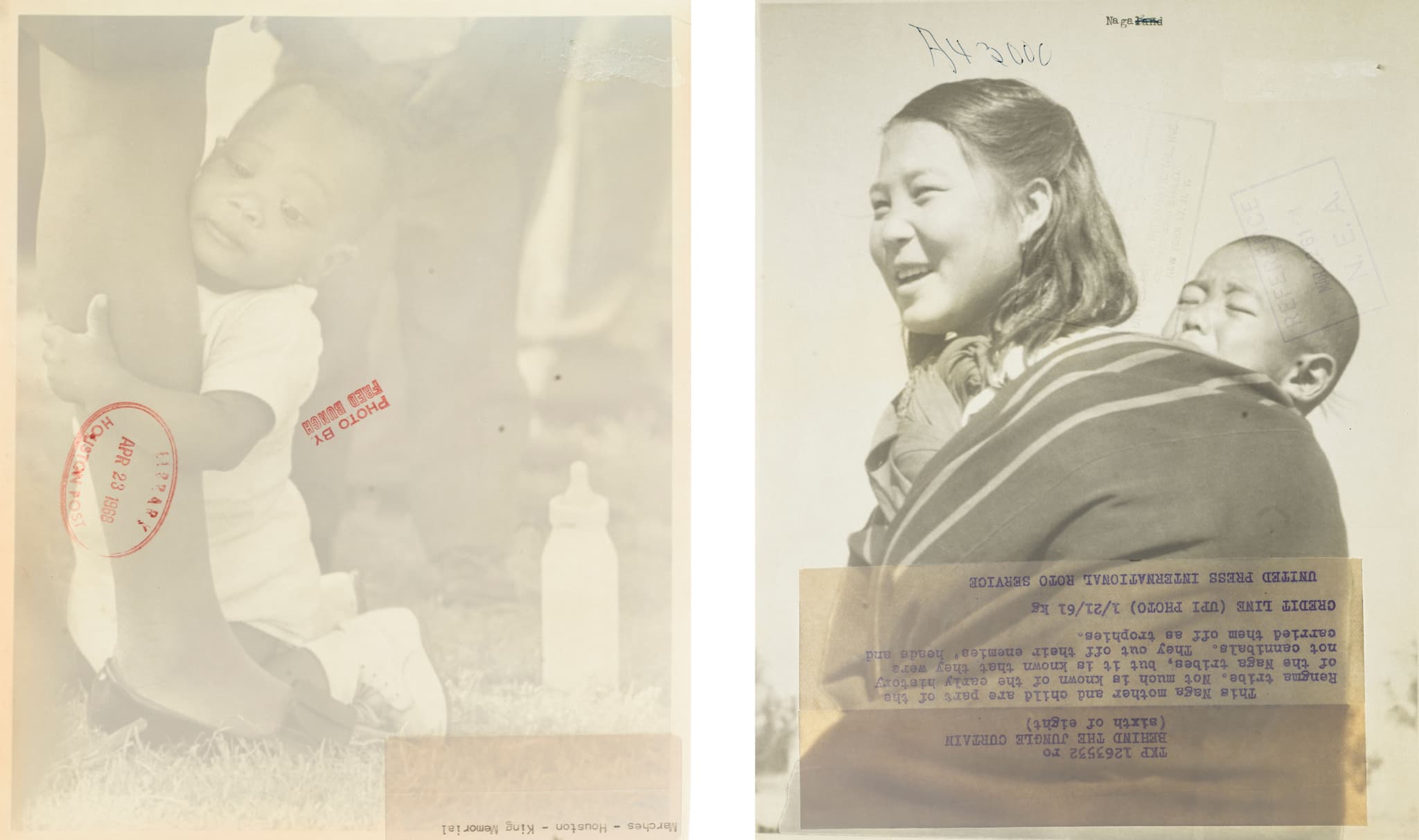 Left: Toni Pepe, Marches, 2022. Archival inkjet. 28″ x 35″. “Marches – Houston – King Memorial, April 23, 1968.” Courtesy of the artist. Right: Toni Pepe, Naga Land, 2022. Archival inkjet. 28″ x 35″. “This Naga mother and child are part of the Rengma tribe. Not much is known of the early history of the Naga tribes, but it is known that they were not cannibals. They cut off their enemies’ heads and carried them off as trophies.” Courtesy of the artist.