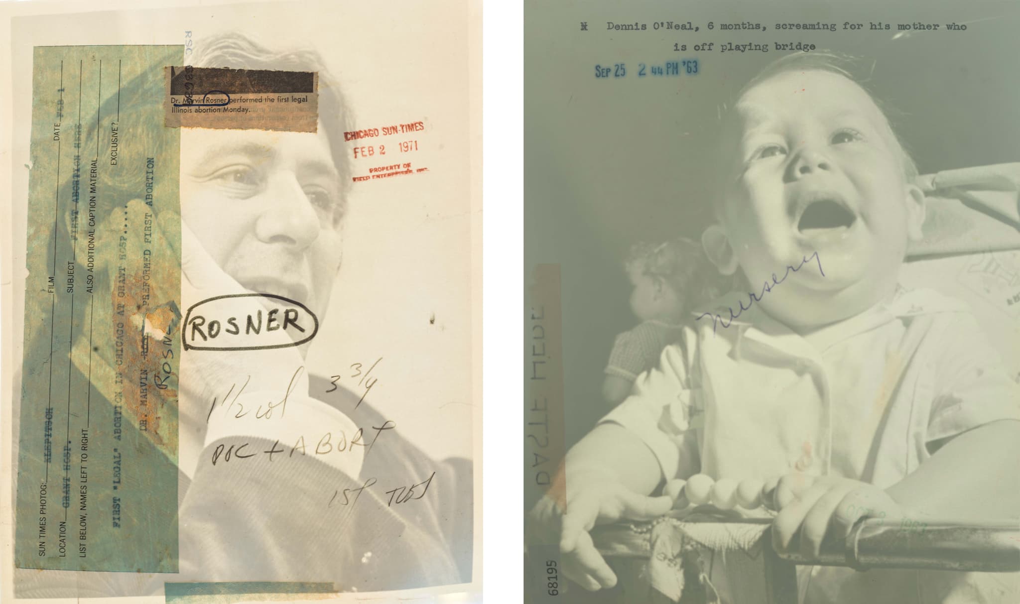 Left: Toni Pepe, First Legal Abortion (Illinois), 2022. Archival inkjet. 28″ x 35″. “Dr. Marvin Rosner performed the first legal Illinois abortion Monday.” Courtesy of the artist. Right: Toni Pepe, Off Playing Bridge, 2022. Archival inkjet. 28″ x 35″. “Dennis O’Neal, 6 months, screaming for his mother who is off playing bridge.” Courtesy of the artist.