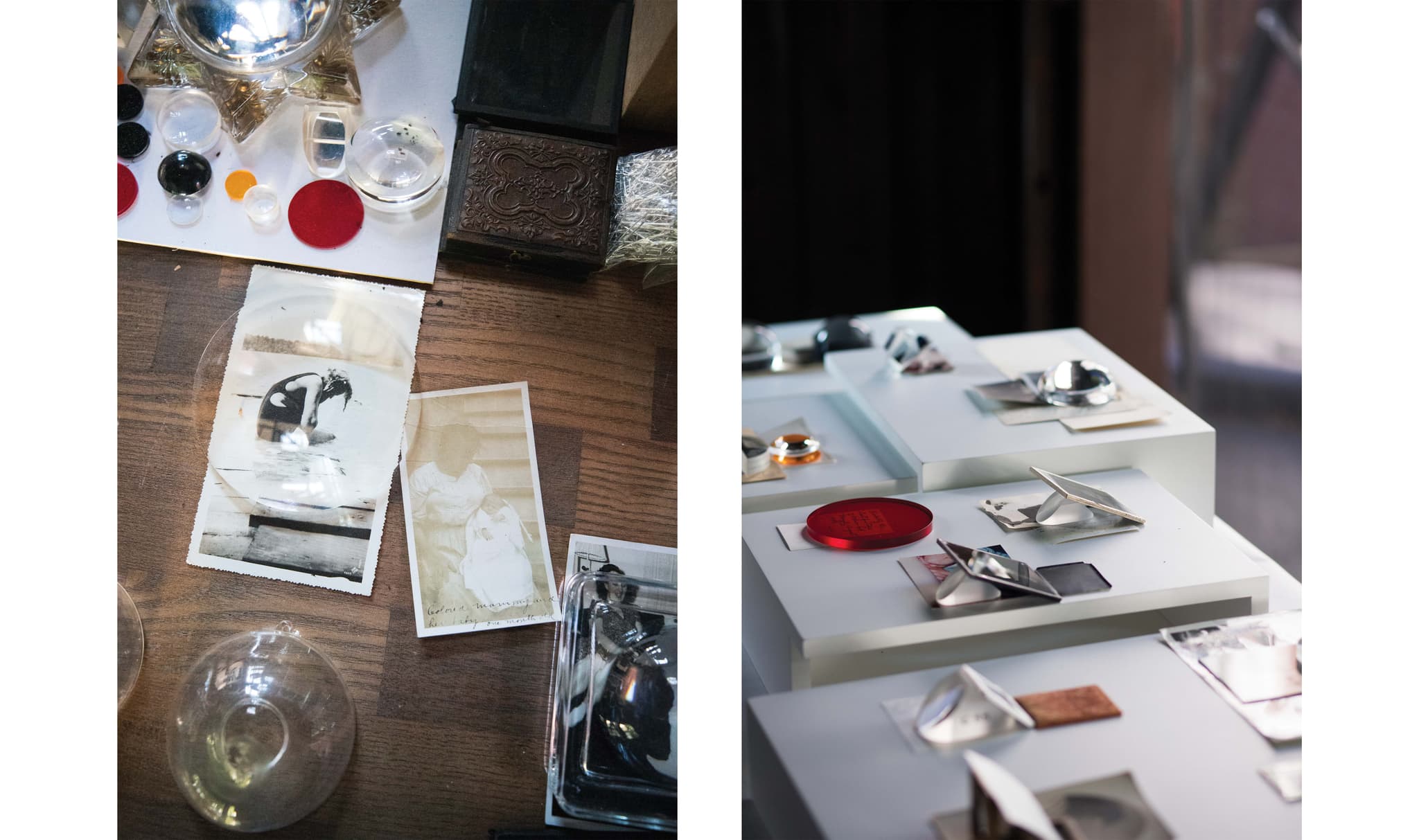 Inside Toni Pepe’s studio, fragments of glass sit atop film negatives. Photo by Carlie Febo for Boston Art Review.