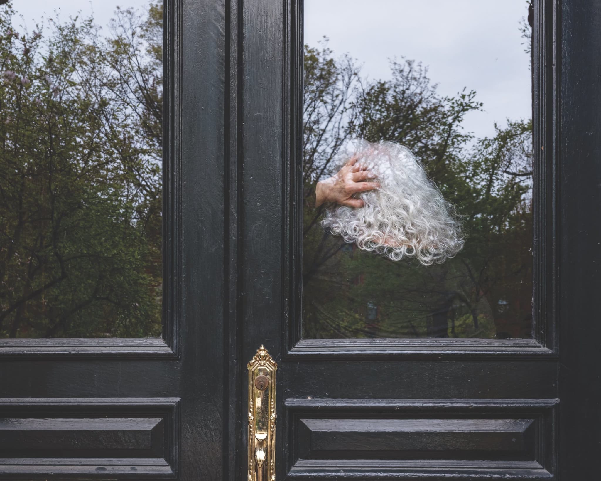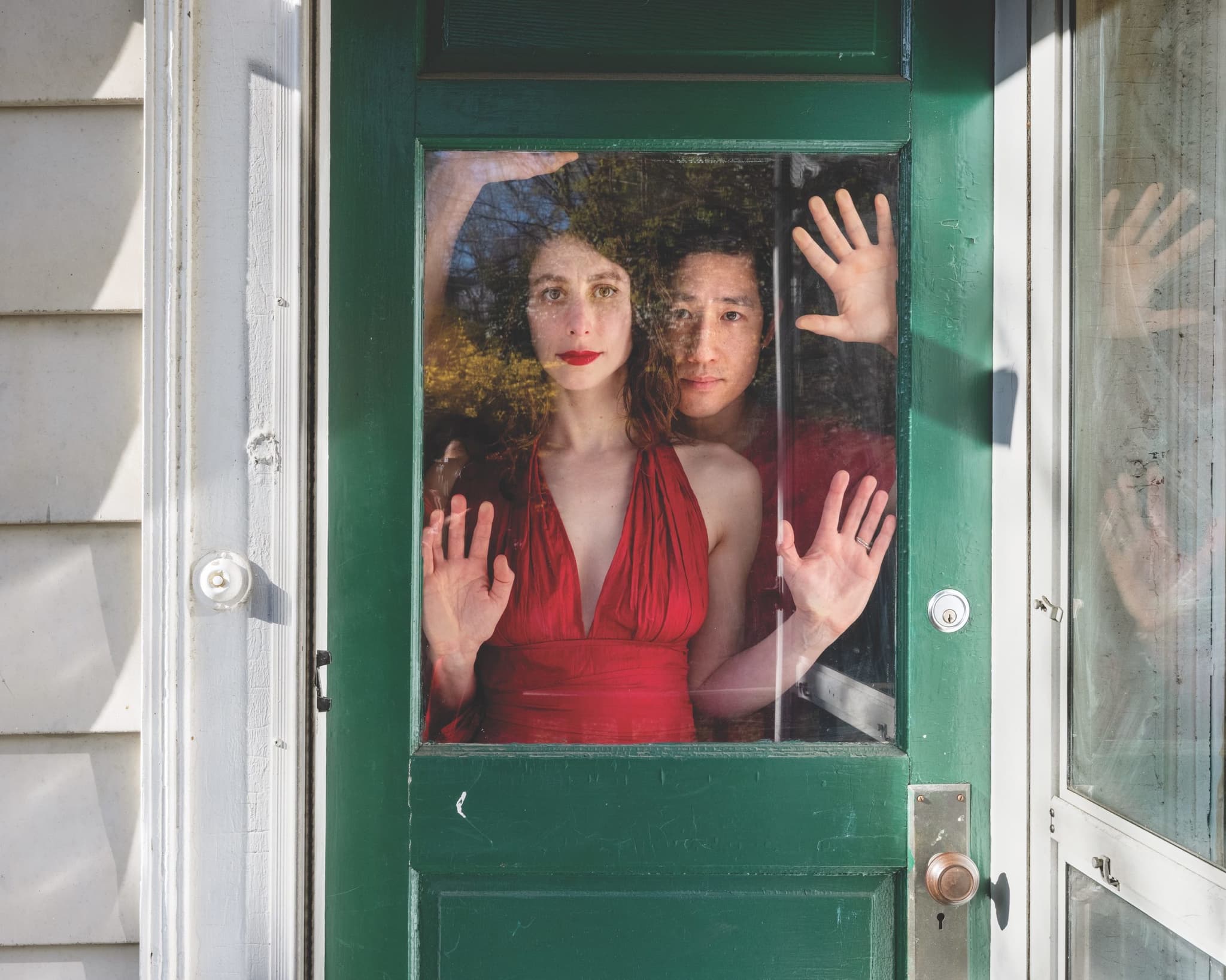 Over the next year, Matar set up over 130 portrait sessions, photographing individuals of all ages and gender expressions and families too—siblings, couples, parents with their children, toddlers holding their elder’s hand. Together, they are a study of the various moods and faces of isolation. Some portraits are watery, ethereal, and in others Matar uses her command of chiaroscuro to dramatic effect. Take this sequence of images in which the subjects chose to close their eyes. Lida, fingers grasping the pendant of her necklace, angles her face toward the sun, the copper of her hair haloed by the dull reflection of a tree. In another, Cyrus’s closed lids are swept with eyeshadow, calling our attention to his lipstick, the earring dangling from one ear, the bright crimson of his shirt. He has dressed up for this shoot, he is, indeed, posing, and he seems to be reveling in this moment of play, of capture, of communion. Matar uses the reflection of the glass to pick up the colors of the flowers outside. A deck comes into focus—slatted floors, a railing, pots of flowers, the corner of a table. Matar has given Cyrus a stage. In another portrait, Matar photographs a couple, Cam and Jared, from a distance. Entwined, their heads and cheeks touch. Seeing their ungloved hands and their unmasked faces so close, I felt punctured. When was the last time I had seen such a public display of affection by two strangers?