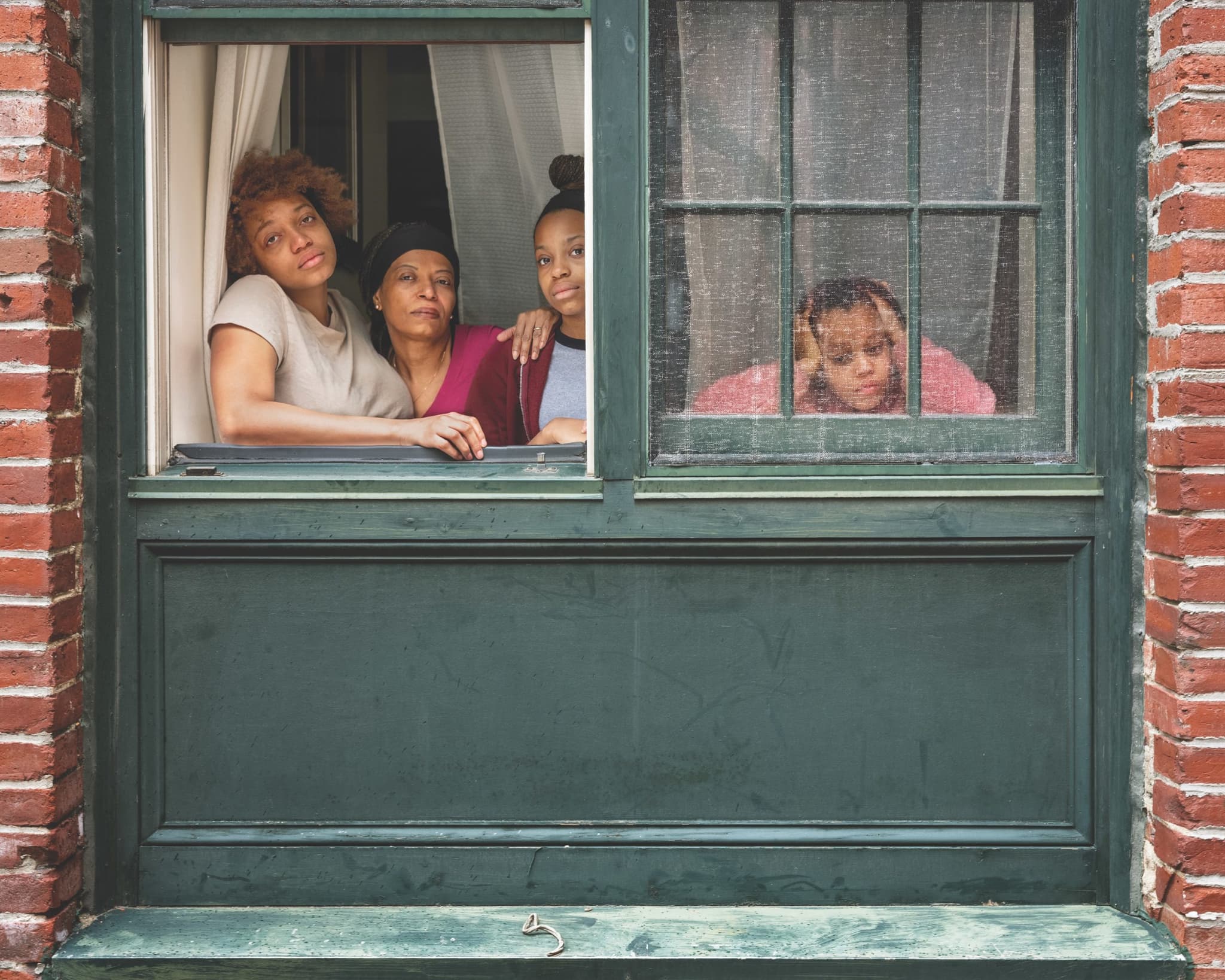 Windows, as a psychological and spatial boundary of private life, are in some ways a perfect visual articulation of “us vs. them.” We, inside, use the porous window to gaze upon those outside. It’s fitting then that Matar, who has used her art to unify, saw windows as a site for connection rather than separation. As she was inundated by strangers’ requests for her to take their portrait, her own process changed. Rather than using a medium-format film camera, she switched to digital, sensing that it was important for the photos to be immediately available to share. At first, she had expected to snap a quick photograph and leave, but sensing that her subjects had time and were enjoying themselves, she often stayed for hours. Her sensitivity, so crucial to building trust with the young, vulnerable subjects of her previous projects, had allowed her to see this time with her neighbors as more than a photo shoot.