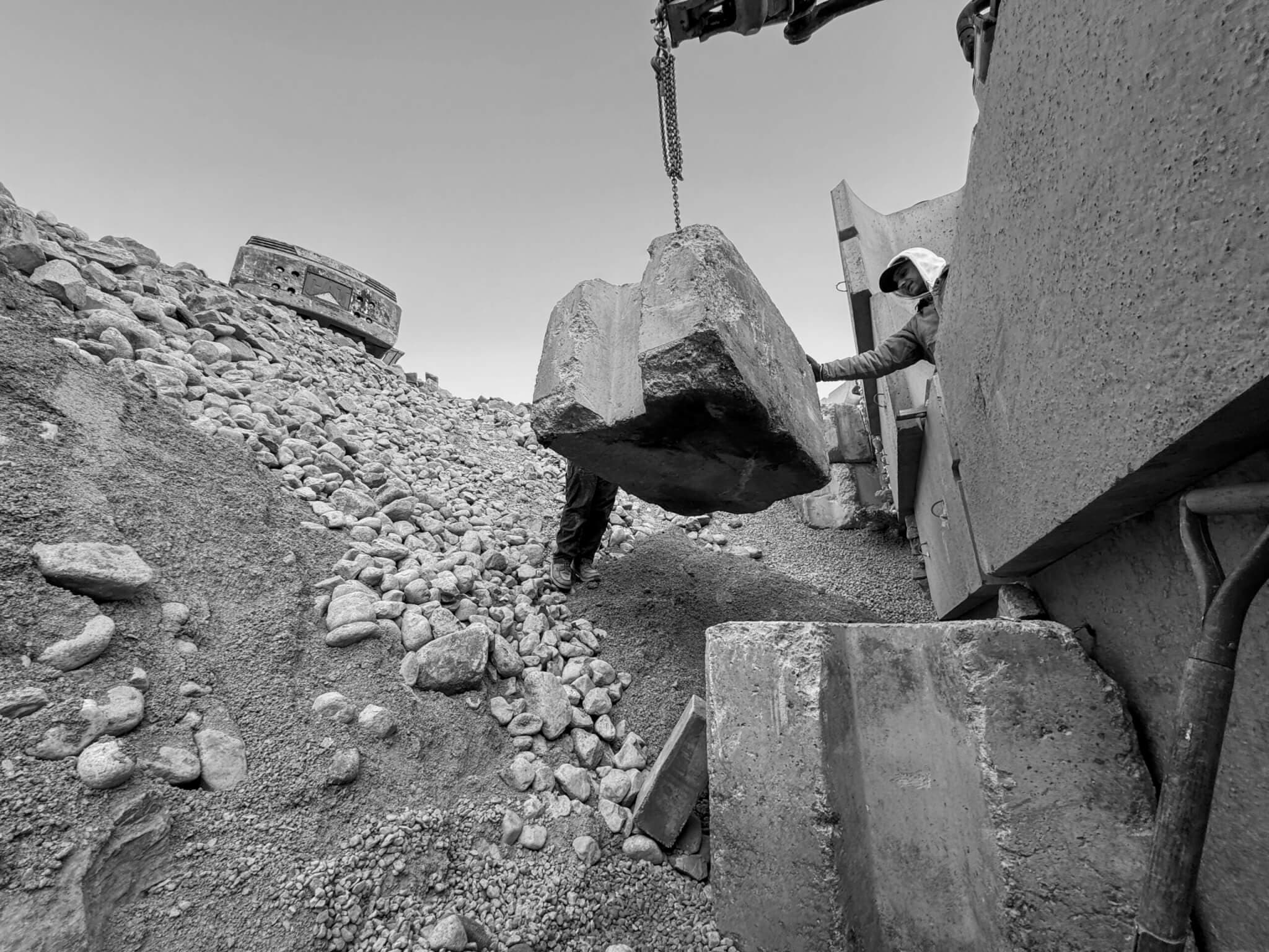 While Wormald’s photos encounter land, Foley’s create it. Block (2025) shows two workers hoisting a block of concrete from a crumbling slope of rock. Shot from below, the titular block hovers above (I hope Foley’s wearing a hard hat), cleaved in half by a shadow that leads my eye up the slope to a stretch of pale sky. The composition is weight; the weight, composition. It’s not just a workyard snapshot, but an image as a product of the asphalt plant, a block native to it, which Foley hoists from the rubble and hangs here in the gallery.