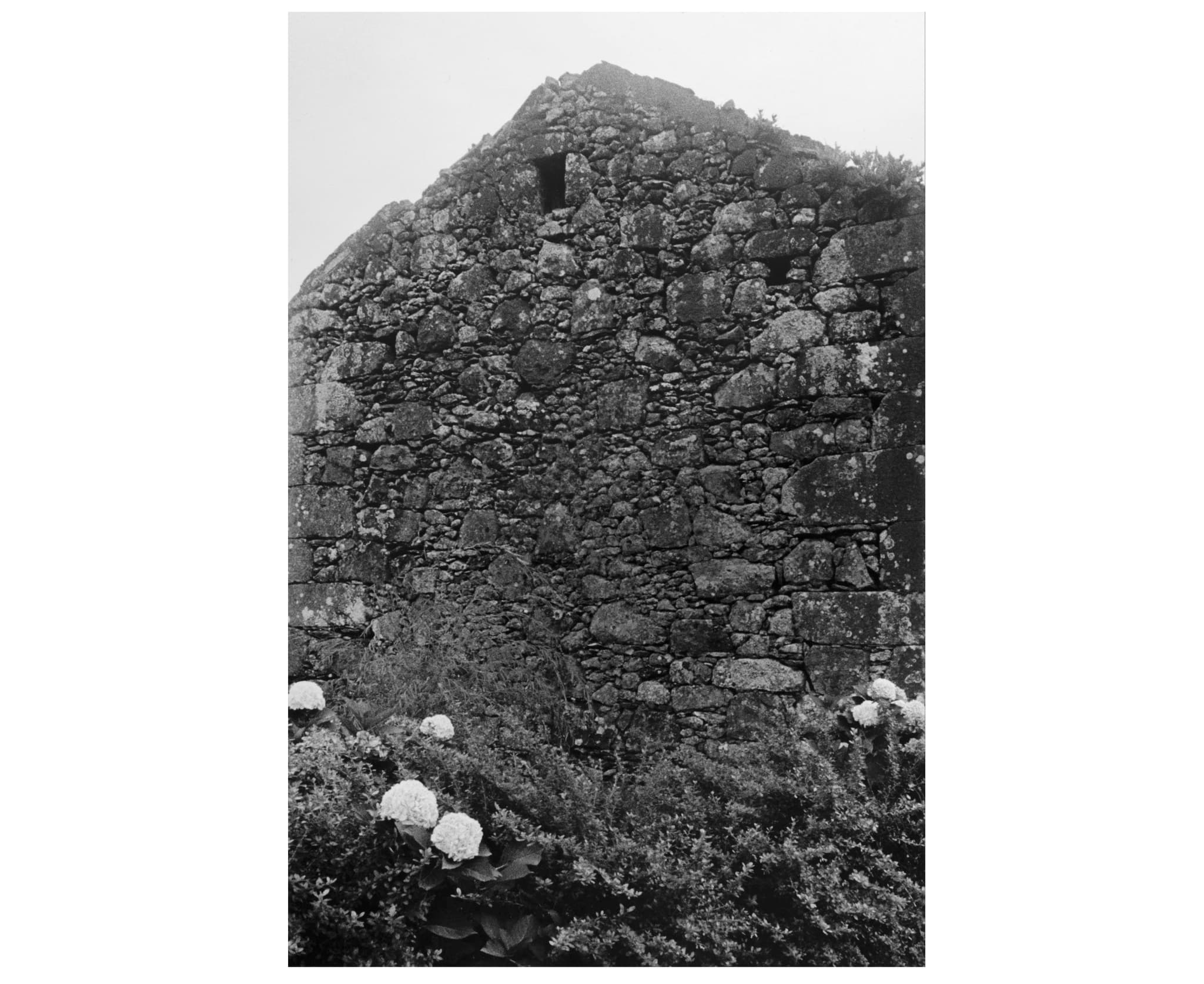 The show opens with Wormald’s Mosteiro, Flores, Azores (2023), a tight shot which presses an architectural ruin into a wall of texture. The creeping lichen atomize into the nooks and crags of the wall, creating a surface that is almost static. This plane of texture takes up a majority of the composition, with a few blips (a dark square window, seven white hydrangea heads, and a wedge of sky) subtly placing the setting. Without color, the contrasts of the wall become pure value, the structure humming with fading light. Instead of simply capturing and reproducing a scene from Flores with the complete verisimilitude of color film, the picture becomes an object of the island in its own right: composition, light, and form distilled down to their purest, most potent essence.