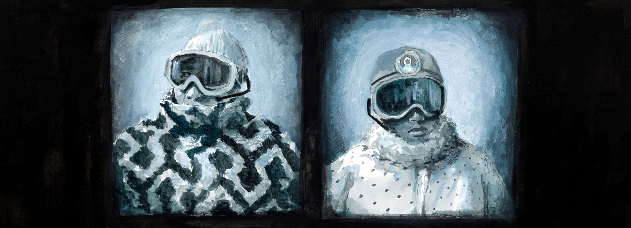 In Ethan’s Wareham Street studio—which includes an animator’s niche where his partner and collaborator Vita Murrow’s drafting table and video camera reside—I ask about his source material, and he points to a line of metal shelves filled with plastic bins. It is somewhat shocking to discover his “costume closet” and set of props are mostly thrift store finds, Scotch-taped masks, faux foliage, and computer printouts of slightly pixelated stock photos. What’s seen in real life or captured by the lens is transmuted by hand into gorgeously rendered works on paper, oil-painted canvases, wall drawings, and children’s book illustrations.