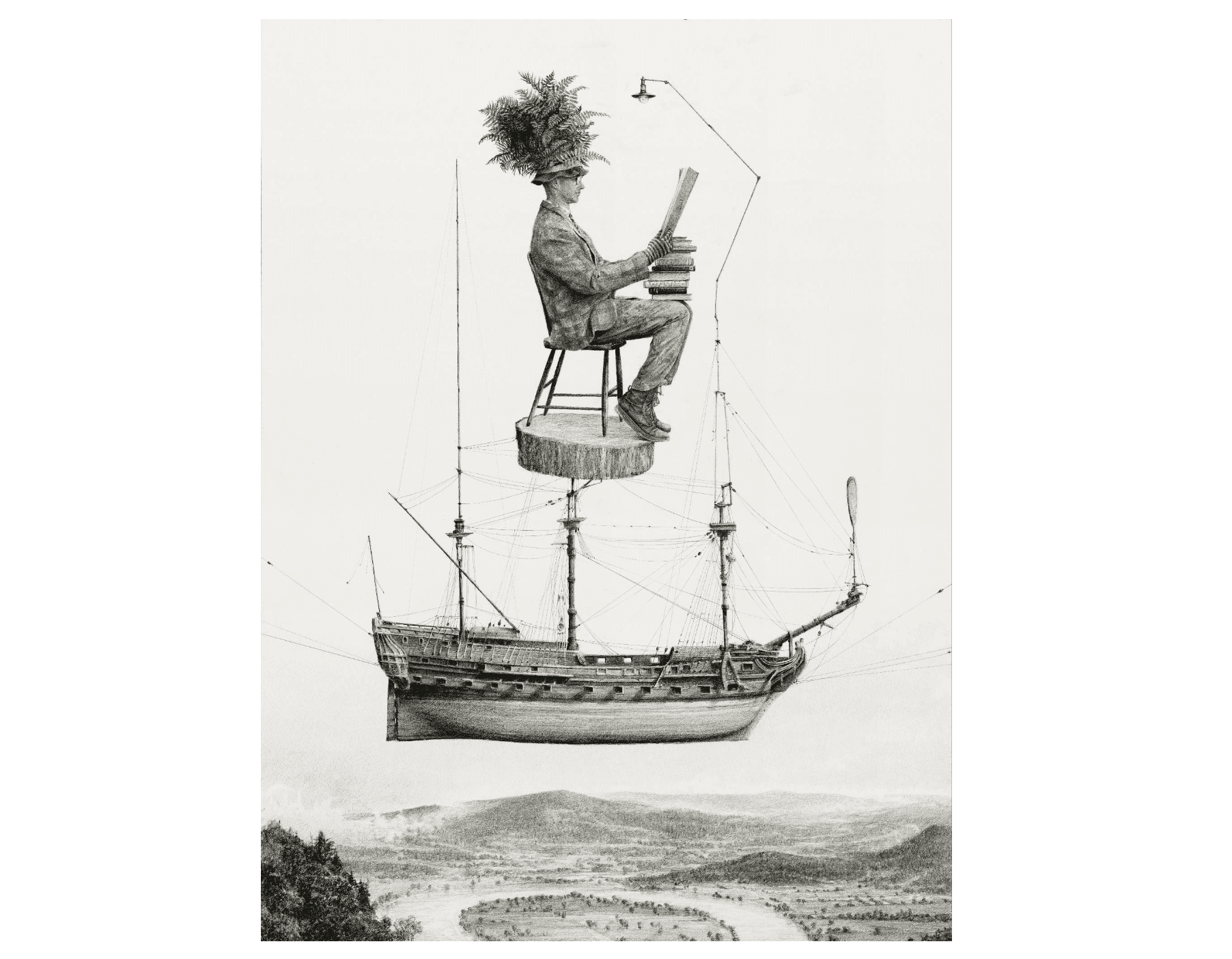 Look at one of Ethan Murrow’s deckle-edged graphite drawings, and you’ll find precise details—the shine on the grommets of a shoe, the cinch on the wrist of a winter glove. In the background, an atmospheric weave of cross-hatched lines dissolves into soft focus, a quality that, from just a few feet away, could be mistaken for the work of a black-and-white film camera. The intricacy and photorealism of these often surreal scenes are the result of elaborate preparation. Before pencil touches paper, Ethan develops source material using research, props, costumes, photography, and performance. As the leading actor in most of his narrative illustrations, he often dons a suit coat or patterned blazer and a lush headdress of plants.