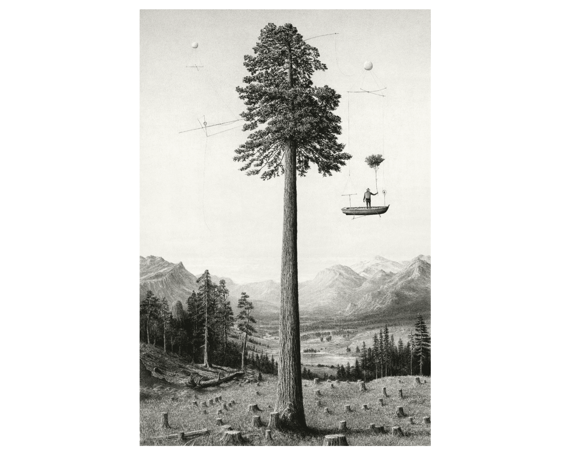 EM: This 72-by-48-inch graphite drawing depicts a fully fledged old-growth tree in British Columbia. Surrounding it are references from historical landscape painting, imagery from photography I’ve taken, plus plenty of invented components. The focal point is a massive tree surrounded by cut woodland, and there’s a character in a boat, suspended from the tree. There are questions about purpose and intent: maybe this person is the forester or the arborist, perhaps they’re helping the tree, or maybe they’re the one that will cut it down. I try to set up narrative cliffs where we don’t know what the character’s purpose might be, and I’m hoping that builds tension in the work. We humans, out of naivete or ignorance, often corrupt things, but we’re also capable of being wonderful, thoughtful, protective, and collaborative. I don’t always know what these characters will do, but I love fiction, I love stories, and I love finding ways to build an environment where viewers might craft their own tales from what I’ve started.