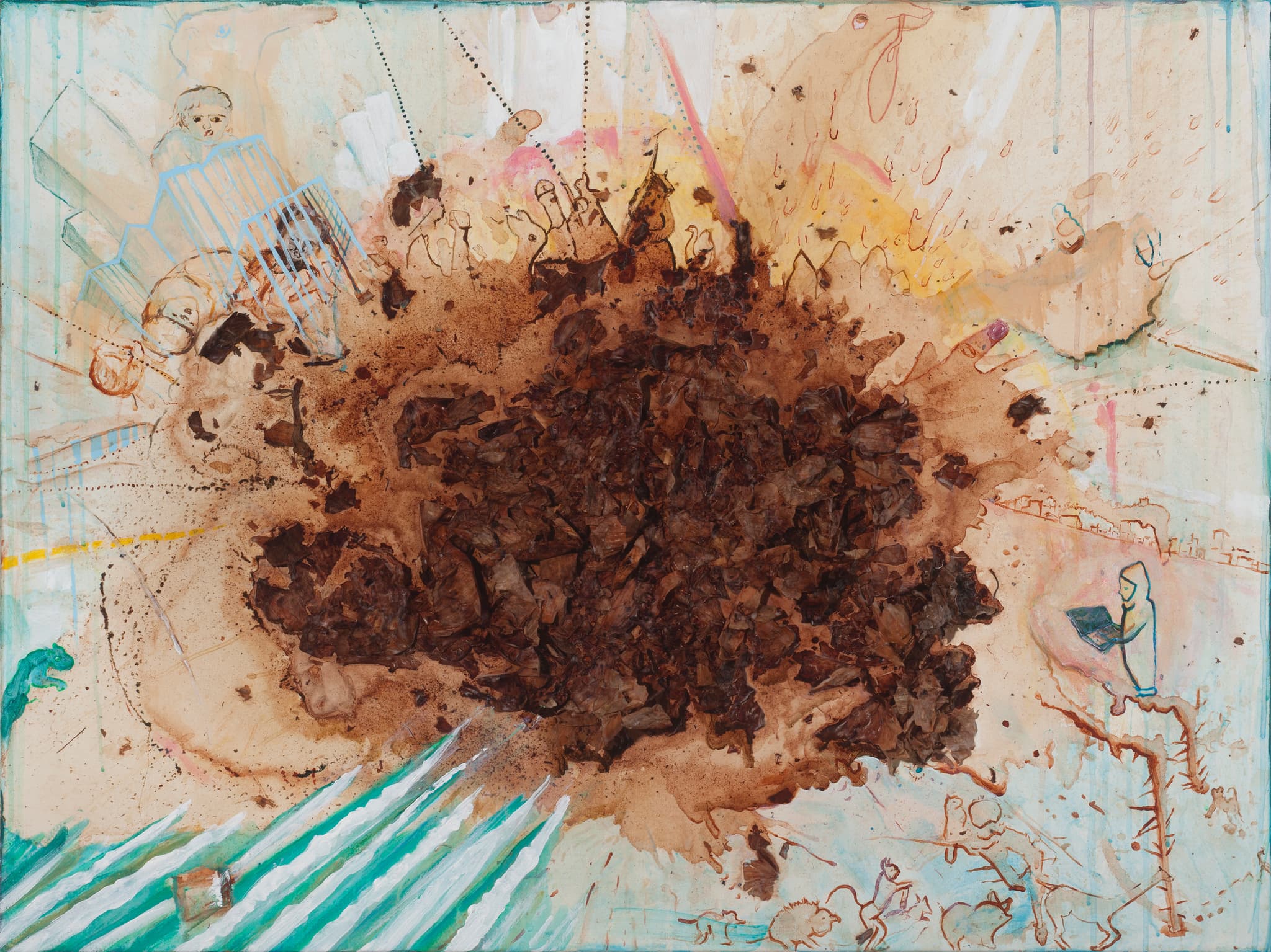 MNO: Well, when it’s all dry, I lift the canvas or paper up. And some of the onion skins fall off, some of them don’t, and so I work with that. It is very much a conversation. The work is in control of me as much as I am in control of it. And so I look at the onion skin stains and the markings left behind, and then I start to imagine. Either events from history or something I heard on the news or almost anything, although they revolve around certain themes, such as displacement, genocide, creativity.
