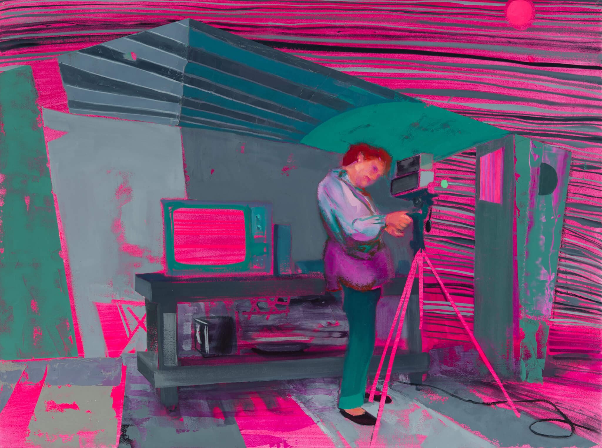 I’m writing this on a dishwater gray day in May as a Nor’easter stumbles in from the wrong season, and the fluorescent colors of Suzanne Schireson’s canvases—hot pink, fuchsia, violet, turquoise—feel downright phantasmagoric, like phosphenes seen with closed eyes after a night of interrupted sleep. Drawing on histories of artist parents like Ruth Asawa and Barbara Hepworth, as well as visits with contemporary ones, the Rhode Island–based Schireson paints a studio of sorts for each of her subjects. But some of these structures are no more stable than the library my three-year-old built from Magna-tiles yesterday. One is just scaffolding, open to the sky and trees. A shed seems too small to stand in; skylights might be holes in the ceiling. In one painting, a woman writes at a desk beneath the bare bulb of the moon. One way or another, the outside world enters these imagined makeshift spaces. The figures in these paintings are working anyway, usually at night and sometimes with a child close at hand, and I am reminded that sanctums are overrated, that caregiving and creating are not antonyms, that our work needs the world and vice versa. —Jacqueline Houton
