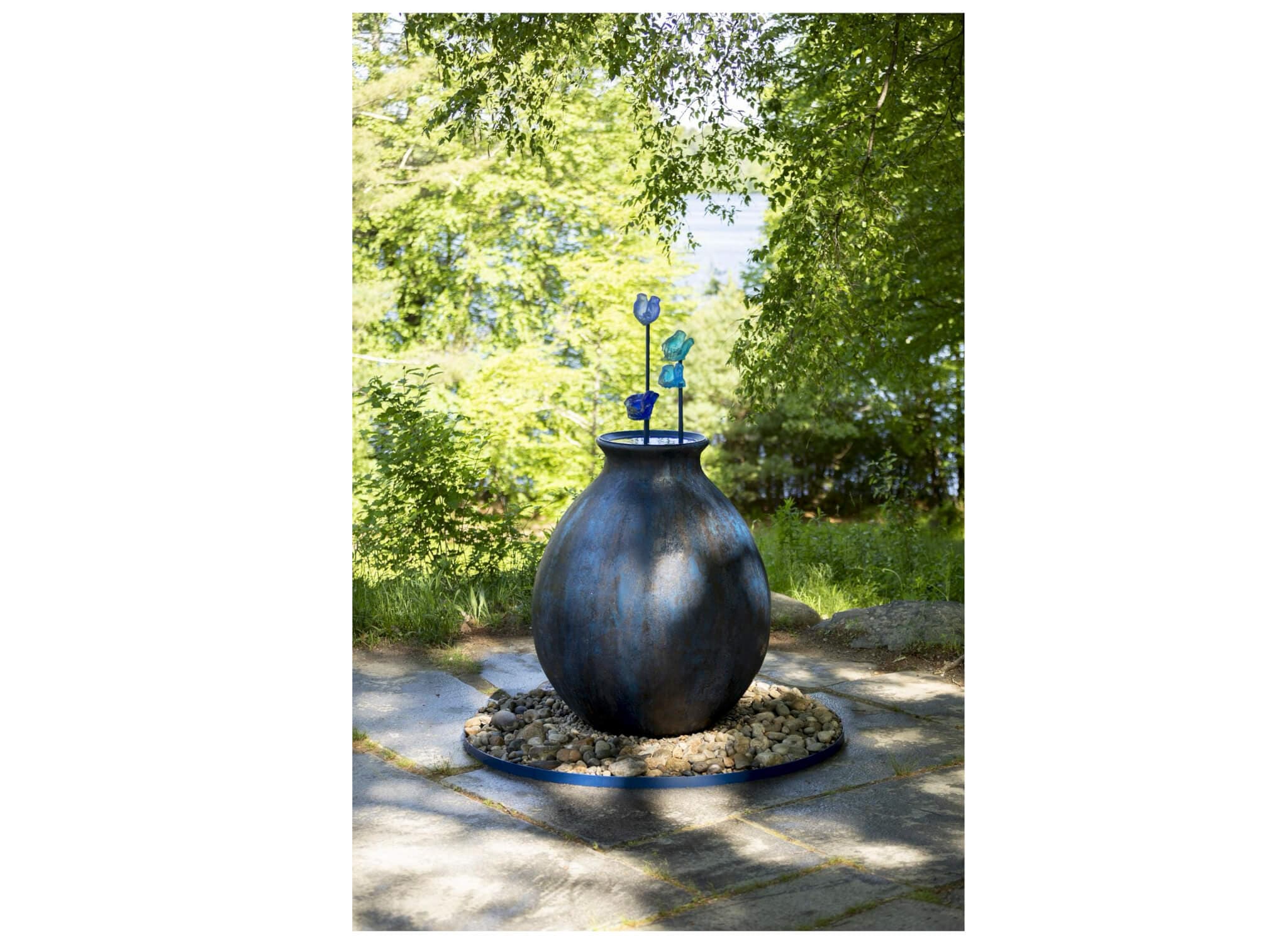 Even the most considered, poetic, and sublime artworks leave a trace. A footpath behind the museum building leads to Holding Water (2025), a work by Boston-based Evelyn Rydz. Installed with Flint’s Pond in the background, the piece is a human-scale sculpture with its own ecology and features the cupped hands of four local waterkeepers cast in shades of blue glass. They’re mounted in a cascading pattern atop an oversized cobalt blue vessel. The vessel is tall and solid with a shallow dip on the top that collects rainwater. While Holding Water results in the unintended death of bees in its shallow pool, it gives life to several spiders that have built mosquito‑filled webs under its lip. When outdoor artworks host our nonhuman kin, artists create a cycle of reciprocity. When rainwater flows over the work’s cascading hands, it provokes the question What about nature is actually ours to hold?