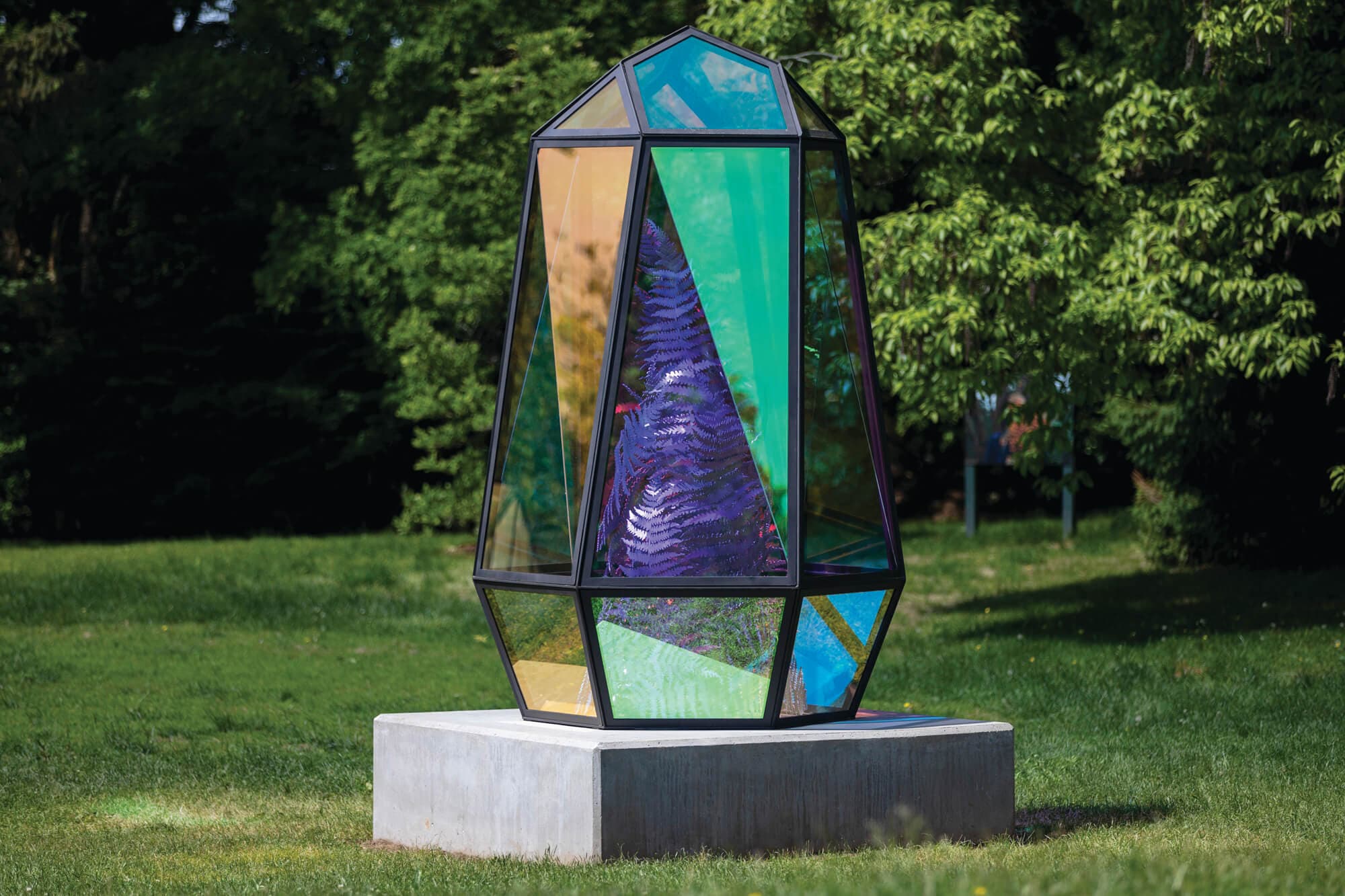 Commentary on complicated botanical histories continues in works by European-based Kapwani Kiwanga and NYC’s Joiri Minaya. Both artists use the history of glass containers to explore ideas around indigenous and imported plants, captivity, and the colonial history of botanical exports to places like Europe, New England, and elsewhere. Kiwanga’s On Growth (2023) is a spiraling fern sculpture set inside a giant prismatic Wardian case, an early form of terrariums used to transport specimens to Europe. Before the invention of the Wardian case, specimens died from the stressful conditions of nineteenth-century transport; their use enabled the rise of a global industry built on the extraction of the exotic. The sculpture is dazzling and beautiful, pointing to the ways we continue to gloss over and repackage complicated, ugly histories for easy consumption. For Tropticon II (2025), Minaya designed an approachable structure, the size of a backyard shed, to explore the limits of and damages caused by the greenhouse (namely the propagation of exoticized plants, extracted for consumption in faraway lands). The work is conceptually accessible and drives home just how pervasive and mundane colonial botanical histories continue to be.