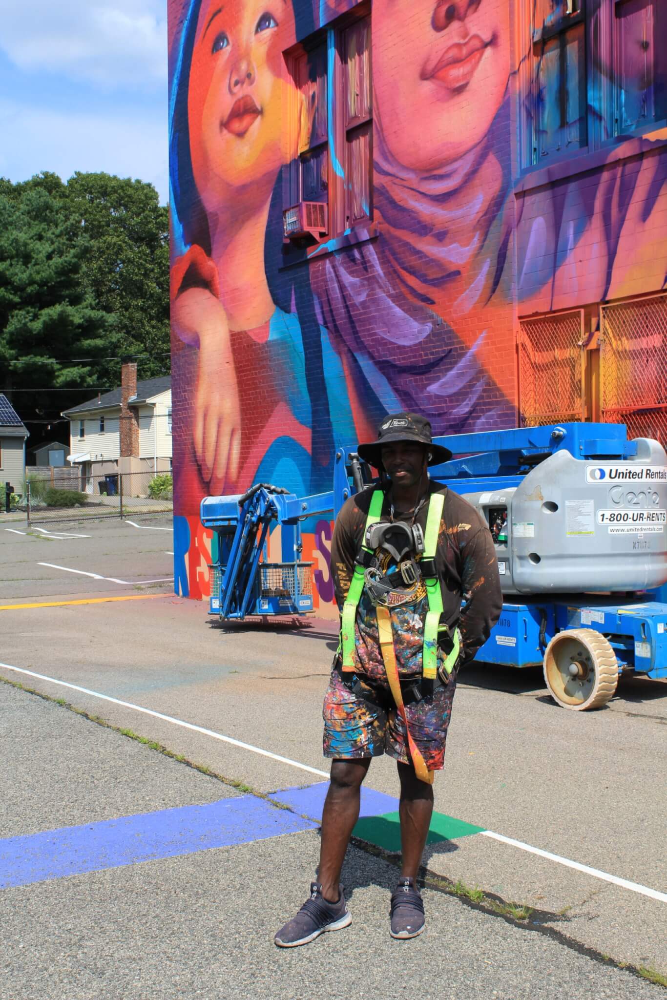 The partnership began with relationship building. O’Connor started by, as she puts it, “organizing a series of mini assemblies across both our lower and upper campuses to be able to introduce Detour to as many students and staff as possible.” Detour flew in to spend three days with the school community. During some of the sessions, students drew ideas for the piece. “The kids at the Joyce Kilmer school were the biggest inspiration,” said Detour. “They were drawing everything from Celtics [players] to baseball to donuts. [The students loved] color and wanted everything to be really big and impactful. That’s where I am, with that intersection of doing a lot of big figurative pieces and throwing a lot of color in there.”