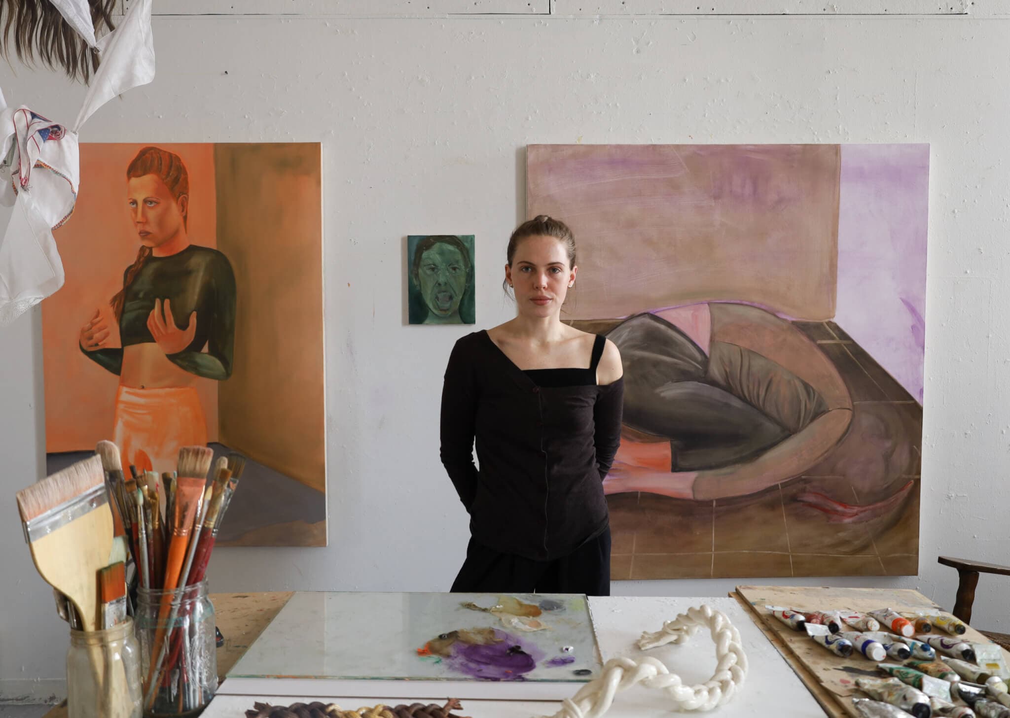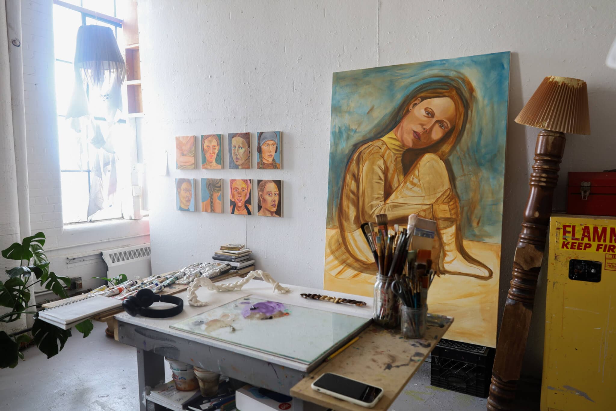 In her studio, there is a rocking chair, a light with a lampshade with blonde hair extensions attached, and Curtin’s sizable canvases. Curtin, who entered the program with a focus on portraiture, was “thinking more about the body, how the body relates to space, and what the experience of living in a body is like.”