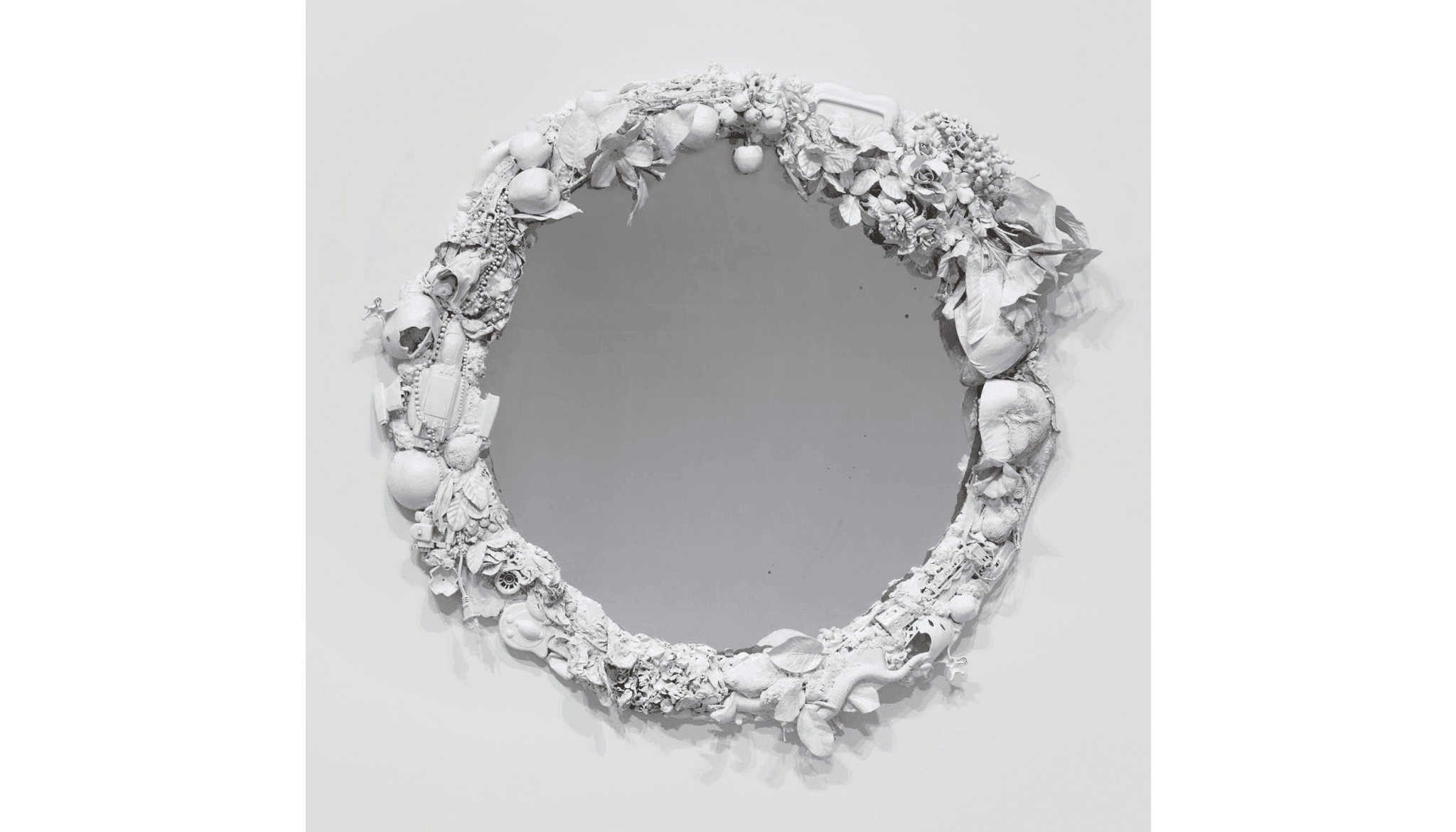 One of her works, Vanitas, contains a mirror encircled with objects such as plastic flowers and fruits, beads, leaves, toys, and a bra. Its shape is a nod to the cycles of nature. The sculpture is smothered with white acrylic, giving the objects it contains a fossilized appearance. It raises the question of what happens to the things we leave behind. Because many plastics won’t decompose in our lifetime, will these items from our present be considered relics in the future? The mirror allows the viewer to consider their own role in answering this question and compels them to grapple with the myriad of objects they accumulate by existing. If we are a sum of the objects we leave behind, what stories do they tell about us as individuals? About our communities? Moreover, the shape of the mirror highlights that conversations around the climate crisis are “going in circles” with minimal to no implementation of solutions suggested by scientists and climate activists. This work can also be interpreted through the lens of motherhood. The fossilization of the traditionally feminine objects in the sculpture, such as the jewelry and the bra, suggests that certain aspects of the self might need to be left behind in order to be an effective parent.