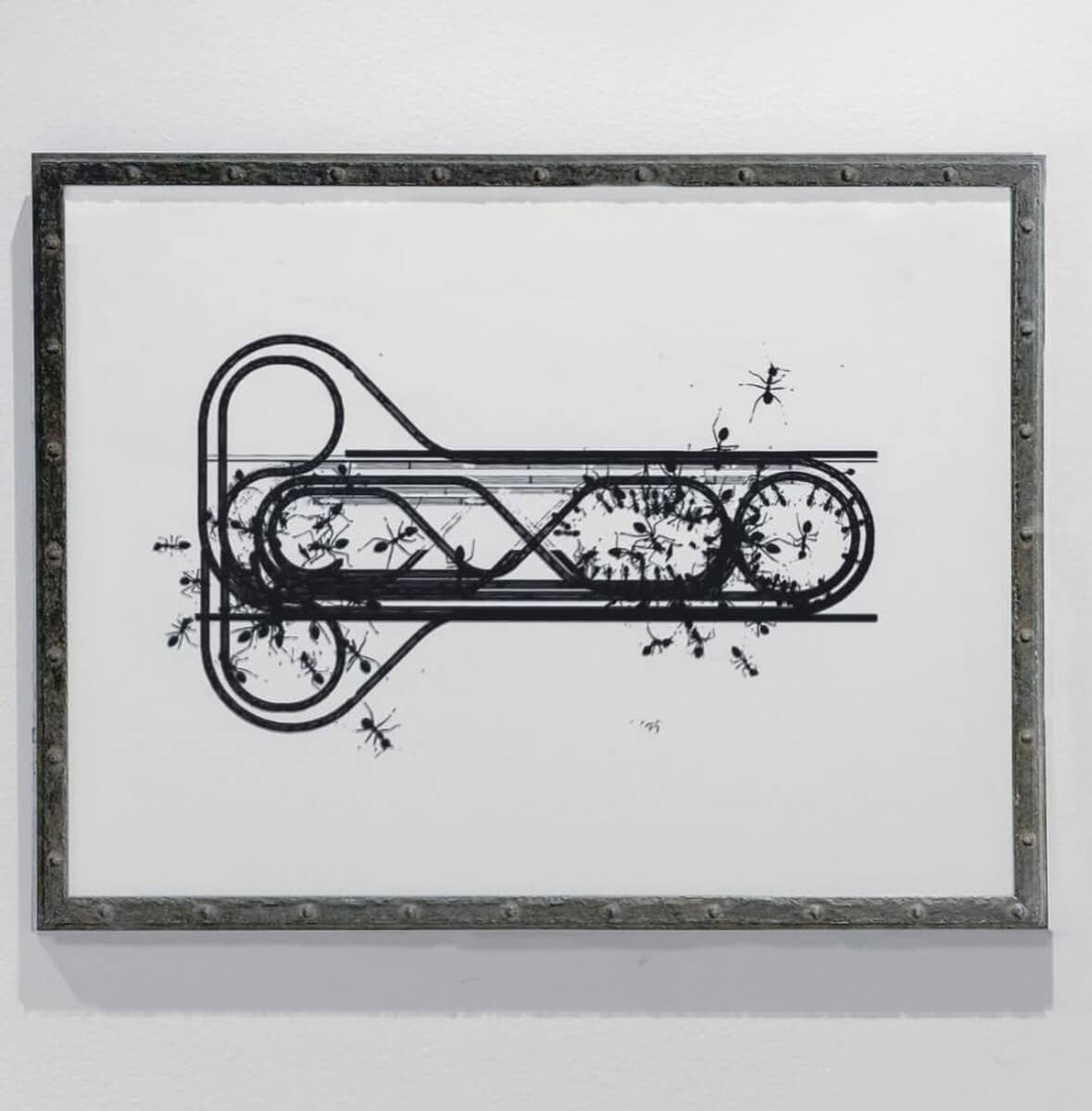 In the second gallery, Silverman’s work is suffused with play while engaging with themes of spirituality and surveillance. Toy train tracks are a recurrent part of their art-making, which includes installations, a sound-responsive LED system, video monitors, and prints. Their Voice from the Whirlwind print series uses diagrammatic language, appearing like airplane hangars, highways, and architecture seen from the sky. Train tracks frame the compositions, like vignettes, and imply the potential for movement. Hosts of ants that are about three times larger than actual scale crawl over the tracks and other linear forms, adding an additional layer that intersects the organic with the technical.