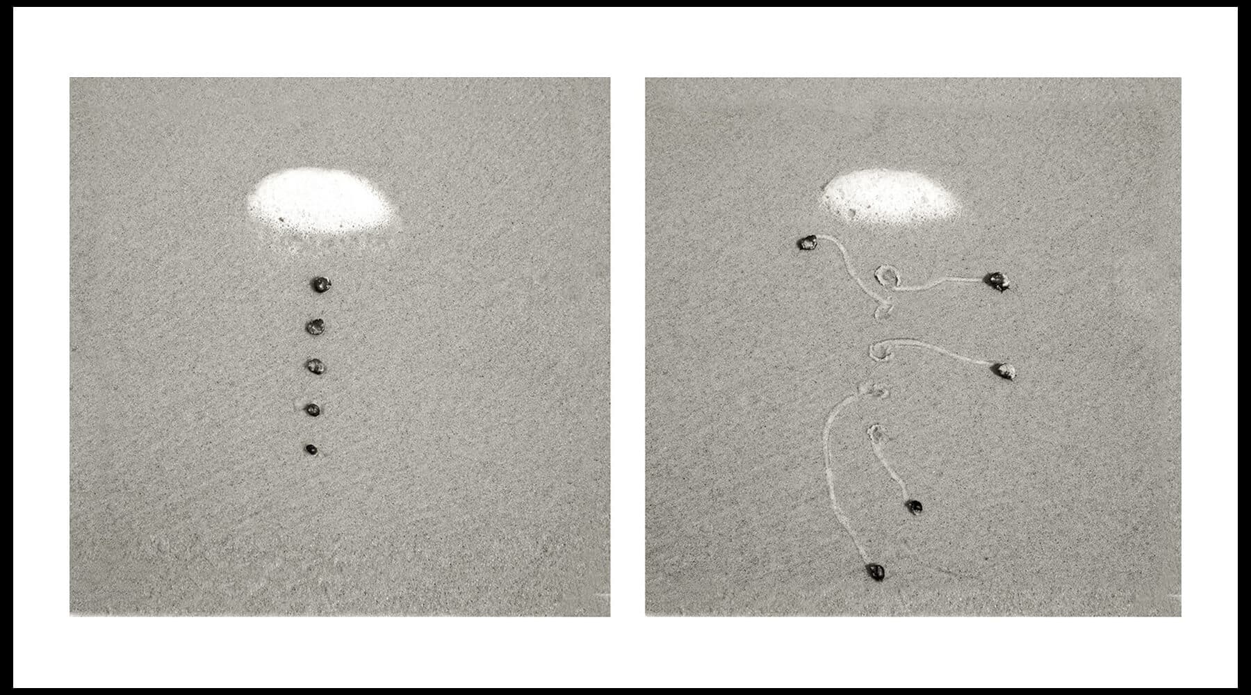 Snails are not often the subjects of fine art; artists who depict the natural world are typically drawn to nobler, or at least less slimy, species. But for Daniel Ranalli, a photographer and environmental artist whose work is currently on display at LaMontagne Gallery in South Boston, these unassuming gastropods are not only worthy artistic subjects, but also creative collaborators. The show, “Snail Drawings,” consists of a collection of photographic diptychs that depict the movement of snails on a beach. In the first image of each set, we see the snails in the careful configuration in which they have been placed by the artist; in the second image, taken twenty to thirty minutes later, the snails have crawled out of their original formation, leaving trails imprinted on the sand behind them. The photographs are small—each individual picture is about a square foot—and shot in black and white. They span several decades: Ranalli first came up with the idea for the series thirty years ago, while taking pictures of snail tracks on Cape Cod beaches at low tide. Soon, he began to arrange the snails himself, influencing—though not controlling—his subjects’ movements. “I am like a choreographer,” he says in a quote in the show’s press release, “whose dancers pay me no attention.”