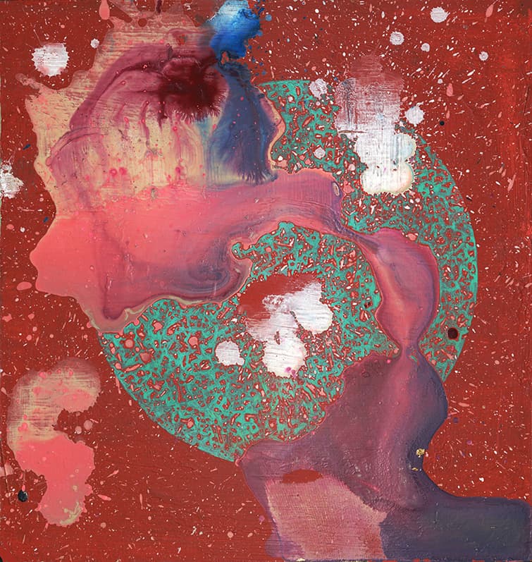 “Trace” relies on cloudy abstraction, splattered and diluted paint that transforms the surface of everyday materials. The effect is a saturated spontaneity, something between the permanence of the solid organic and the dissipation of water vapor. This fluidity is product of meditative repetition.
