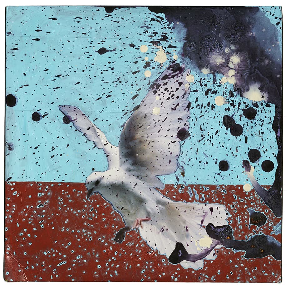 The splatters and traces manifest themselves across different moods, providing a colorful guide to the the figures and subjects included in the exhibition. “Tide Up” for example, is nearly gelatinous, coated in hues of red, purple, and blue. Together, the colors run into each other to produce the effect of alien landscape. However, in “God Goal” they cast the subject as cosmic and ecstatic, adding swirled texture to the portraiture. Whereas, “Virtue Blues” is more moody and ruminating, casting a hued shadow over a white dove.