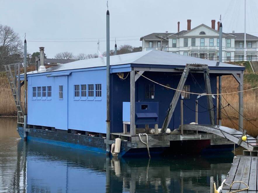 Exterior of the 100 Lagoon Pond houseboat after being transformed into a gallery. Photo courtesy of Marion Wilson.