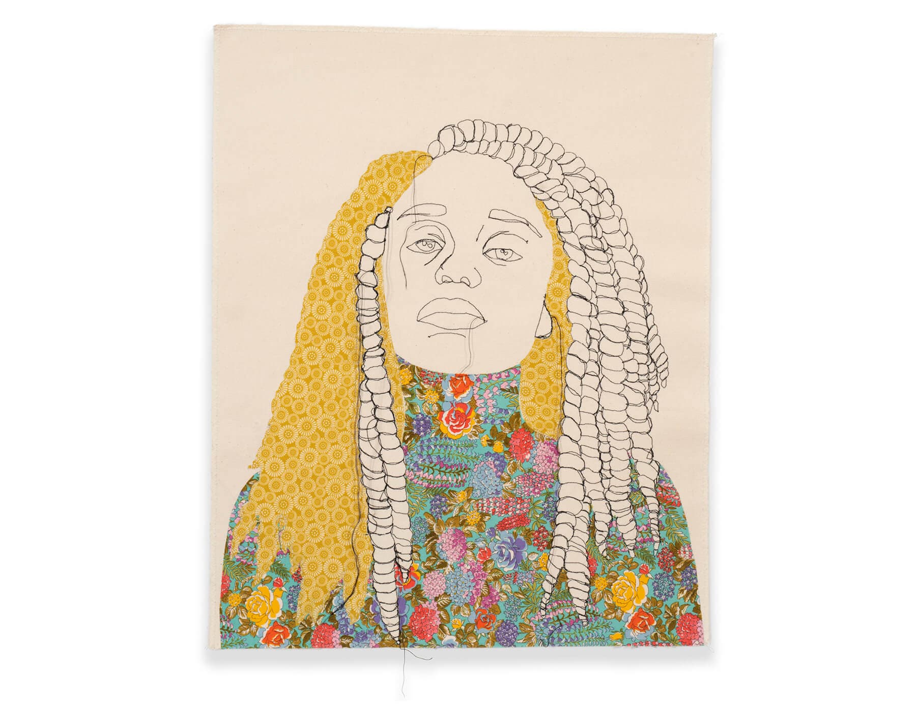 Some of Swaby’s serial works include intricately embroidered portraits that outline facial features and clothing, while in others, Swaby relies on vibrantly patterned textiles to fill-in her subject’s visage. Through this abstraction, the lines between body and fabric blur, and the woman blooms. While “Fresh Up” opens in Salem this August, I was delighted to see some of Swaby’s newer portraits earlier this month in Harlem at Claire Oliver & Ian Rubinstein Gallery where the artist is represented.