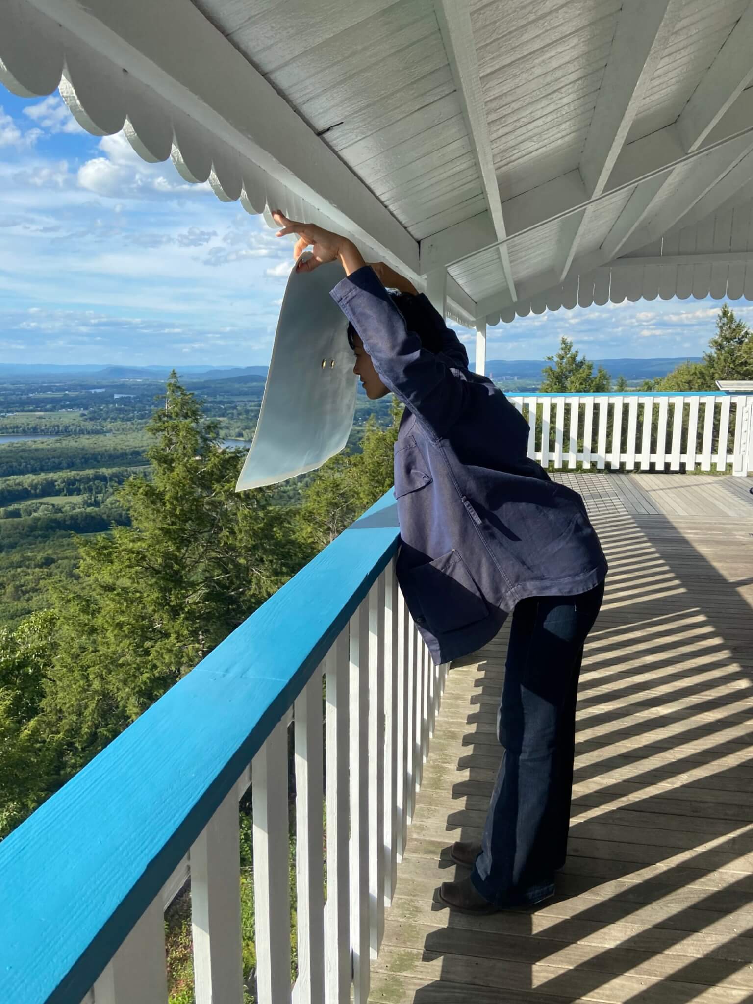 These moments invite questions about the exhibition’s seemingly un-problematized relationship to history. Throughout, I found myself grappling with the presentation’s relationship to its historical trappings—the many references to nineteenth-century art and Victorian-era attitudes toward health and the outdoors present both at the site and in the curatorial framing. (A critical examination of the visual codes and religious and cultural norms that fueled the Industrial Revolution has underpinned several recent scholarly accounts of the period’s unchecked resource extraction and its formative effects on climate change.) Do the organizers consider their efforts in continuity with the Hudson River School’s idyllic pastoral representations? The contemporary reception of this era of landscape painting acknowledges how these images inspired nationalism and employed visual conventions of domination (aerial views, for example) to fix the landscape in a settler-colonial gaze. At the same time, these works stirred ecological consciousness and appreciation for the natural world. Animating connections with the environment is a primary objective at “The Summit Show,” too.