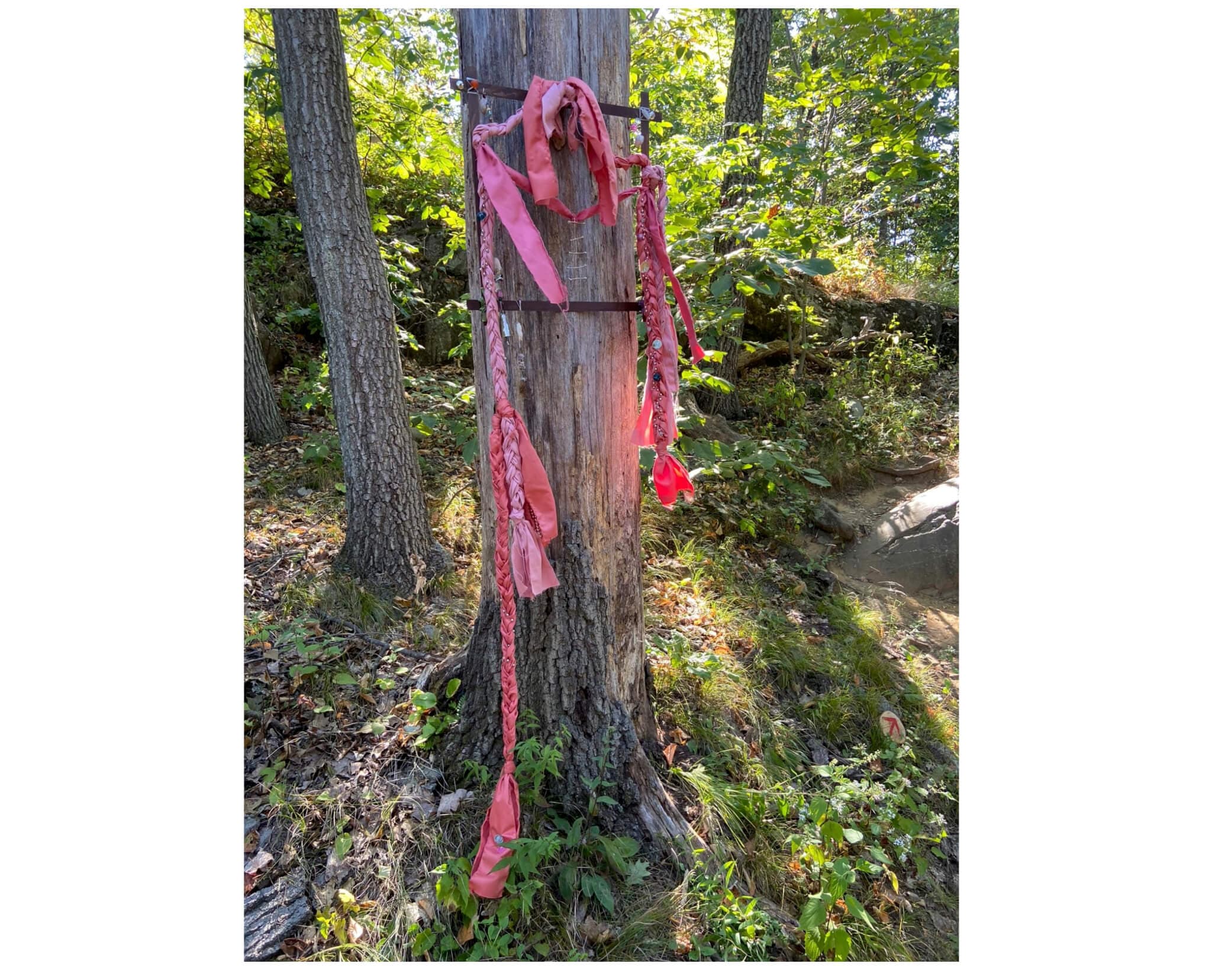 For two consecutive weekends at Skinner State Park in Hadley, outdoorsy types can take in a contemporary art exhibition on an incline. “The Summit Show” features works by more than forty artists mostly based between the Berkshires and New York City. Curated Charlotte Kohlmann, co-founder of Mundus Press, the outdoor exhibition is inspired by the Mount Holyoke landscape and its history. “The Summit Show” builds on the concept of their 2021 “The Swamp Show,” a memorable presentation where works installed in an algae-covered inlet of the Connecticut River were accessible by canoe and performances took place on a floating raft. Four years apart, the unruly and fun pair of presentations map onto two opposing perspectives—the worm’s eye and the bird’s eye, respectively— of the u-shaped, “Oxbow” bend where the Connecticut River loops around itself in Northampton.