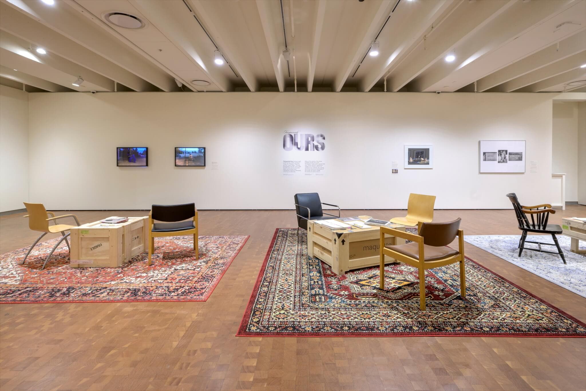 The eight artists chosen for the exhibition by curator Kamala GhaneaBassiri bring together works that preserve a moment in time and experience for a group of people. I appreciate how a reading area set up in the center of the gallery space connects each community’s specific realities into conversation with one another. Inspired by the Nafar Abad neighborhood’s gathered sofas in Hashti Tehran, GhaneaBassiri crowdsourced chairs from offices throughout the museum to pair with three large wooden museum shipping crates covered with artist monographs, calendars, poetry collections, and other printed materials that tie in with the exhibited works.