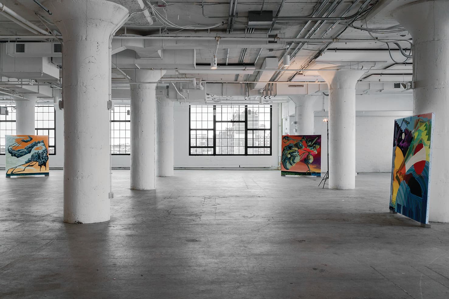 The exhibition “Passing Islands,” featuring a body of work by Christopher Schade was organized by Boston-based curatorial duo Kari Adelaide and Max Razdow who collectively go by the name The Sphinx Northeast. While on view at Boston Design Center, the show presented many of the paintings as the exhibition title suggests, as passing islands. Oil paintings on canvas, some propped against thick white columns in the expansive venue, allowed for each painting to be viewed from various angles, not unlike an island—front and behind. Other smaller mixed media works were framed. What if islands were able to expose their bones, in this case the stretcher bars, that reveal layers of history bringing each landscape to fruition?