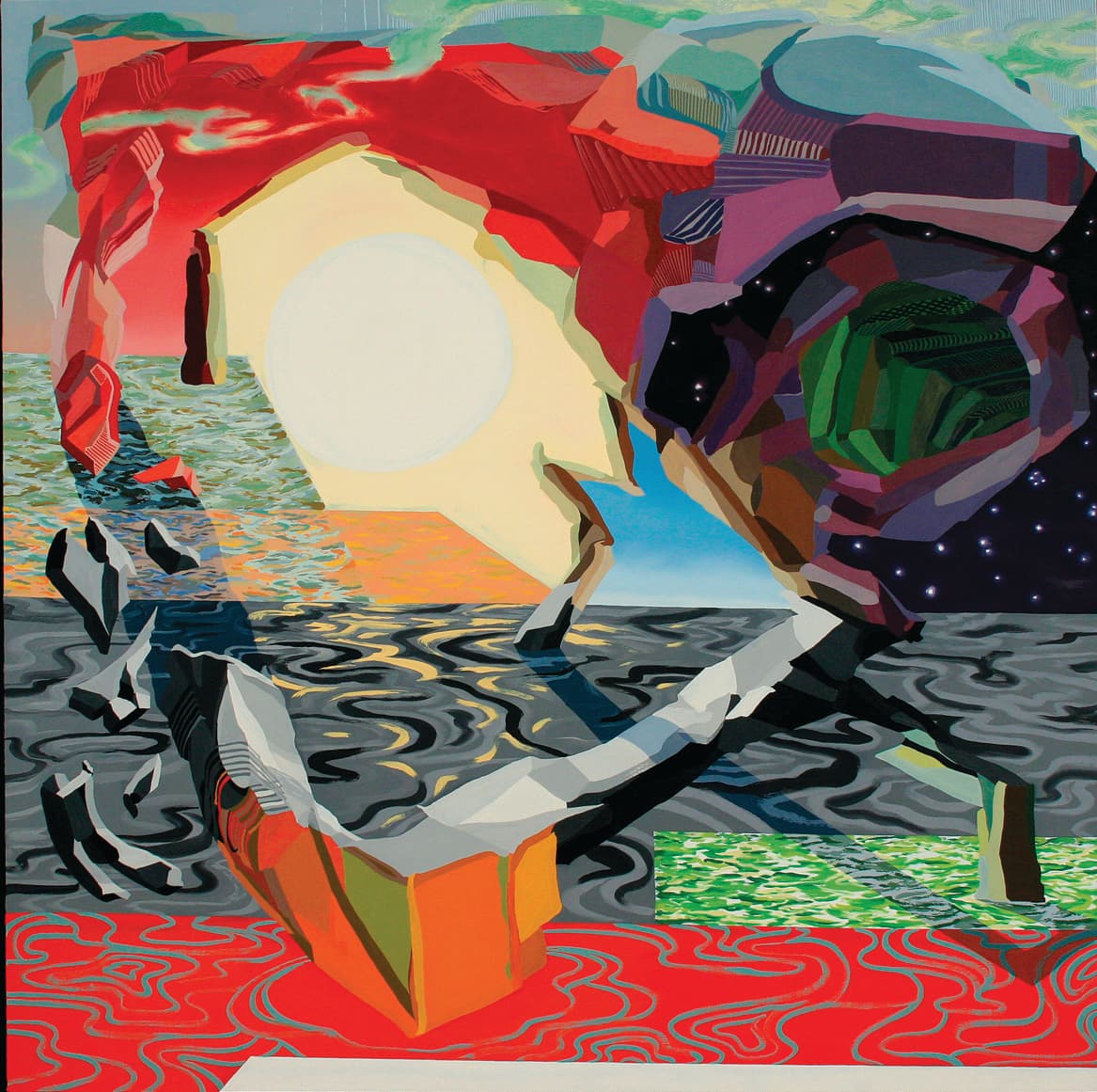 In “Shifting Island,” 2003, one of the earliest oil on canvas works in the series, the artist made the smallest of gestures that turned out to be a catalyst for making more work. He altered the angle of the horizon line ever so slightly, outside of the realm of what we would see in a three-dimensional world. Inside the world of the painting, boats would not float on a flat plane but rather climb thirty percent skyward while sailing this painted sea. Yet there are no boats present. Instead, an unknown, unrecognizable shape emerges out of the water and projects itself skyward. Alien-like tentacles stretch between bulbous forms that could be part of an insect body, or swollen rocks. Either way, while striving to identify moments of representation, the painter dictates his own landscapes that seem to defy gravity. Utilizing various directions and channels, his brush moves purportedly or seemingly without a particular methodology however, the forms are solid, dividing the surface harmoniously through gestural marks. In a painting, an island can be invisible, floating, a portal, a moment bathed in sun or a surface exploding. It’s as if each painting asks us a rhetorical question: what does it mean to disrupt?