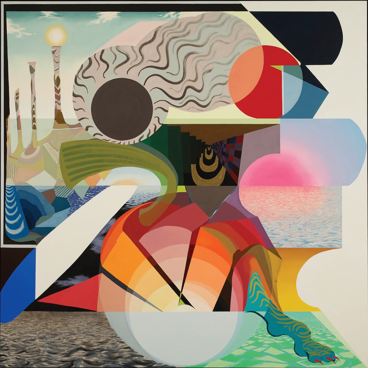 The process of making the painted series on canvas had multiple lives that expanded over a series of seven years. The artist halted these large-scale iterations due to a family tragedy but continued their process and or where the process was starting to lead him, intermittently through the works on paper. In reducing the size, going from 6 foot square to roughly 9 1/2 inches by 8 3/4 inches, and the most recent being the smallest at 4 1/2 by 4 1/4 inches, he loses some of the vibrancy found on canvas but gains an immediacy that the larger-scale lacks. Yet the title of the most recent in the series, Sunset Island, feels like not only the closing of a day but the reminder that there is a new one right around the corner. While on view for a brief window of time, it provided just that, windows into an uncanny world of Schade’s own making.