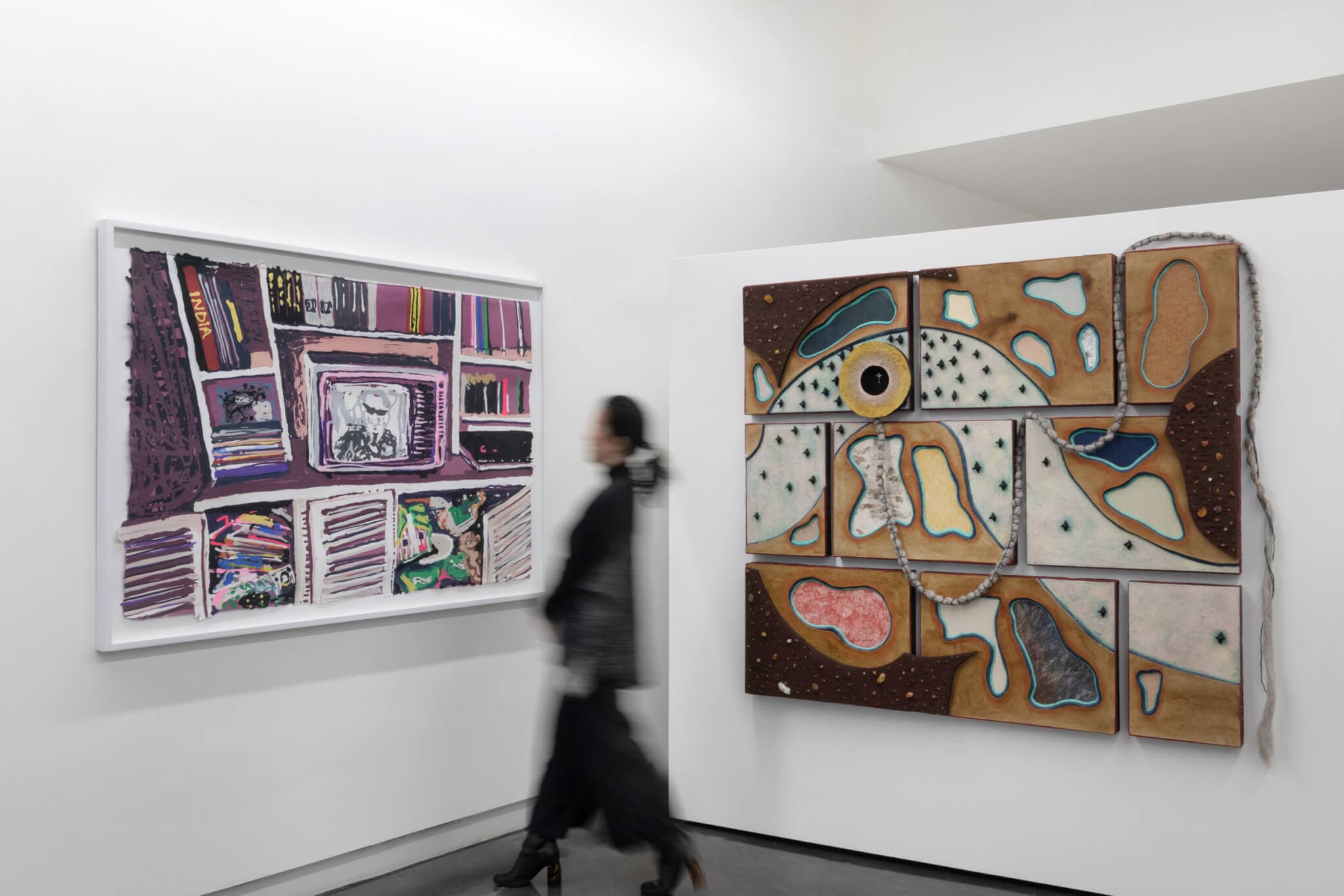 (left) Melissa Joseph, Built-Ins, installation view, 2023. Linen pulp paint on abaca base sheet. 40 x 60 inches. (right) Julia Norton, Excavation, installation view, 2023. Assemblage with various papers, black walnut ink, ochre pigment, soil, lapis lazuli, bone black (from cow bones), rocks, devil’s seed pods, sheep wool, naturally dyed yarn, and opossum vertebrae. 68 x 80 inches. Installation view, “Pulp Memories,” 2025. On view at Praise Shadows Art Gallery through February 13, 2025. Photo by Dan Watkins Photography. Courtesy of Praise Shadows Art Gallery.